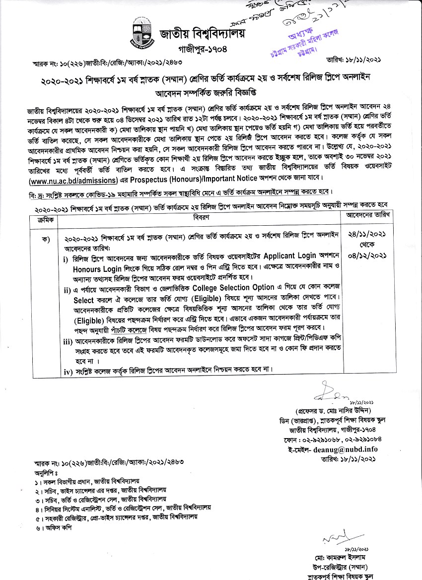 ২০২০-২০২১ শিক্ষাবর্ষে অনার্স ১ম বর্ষে ২য় রিলিজ স্লিপে ভর্তির আবেদন সংক্রান্ত বিজ্ঞপ্তি (২১-/১১/২০২১)