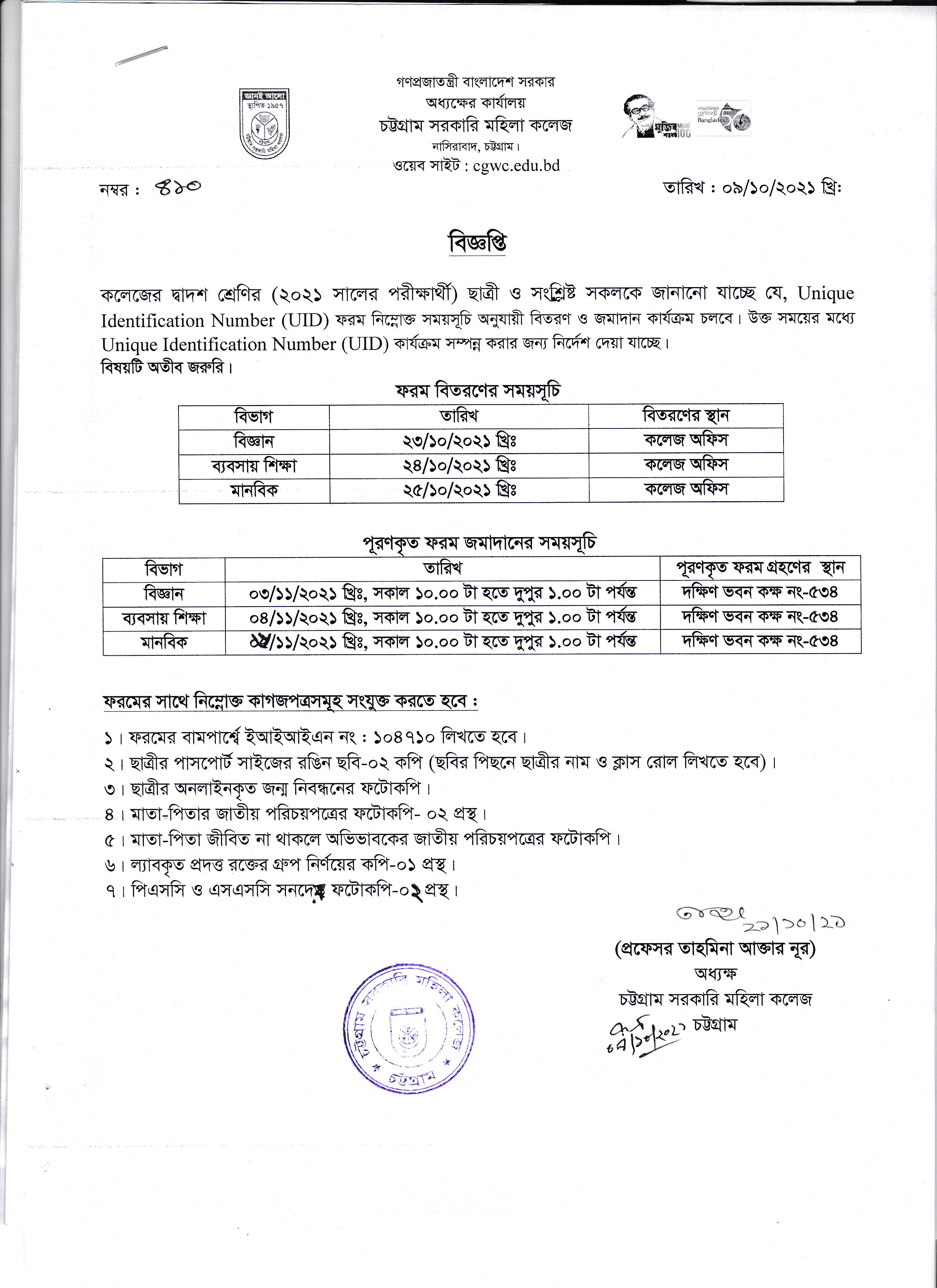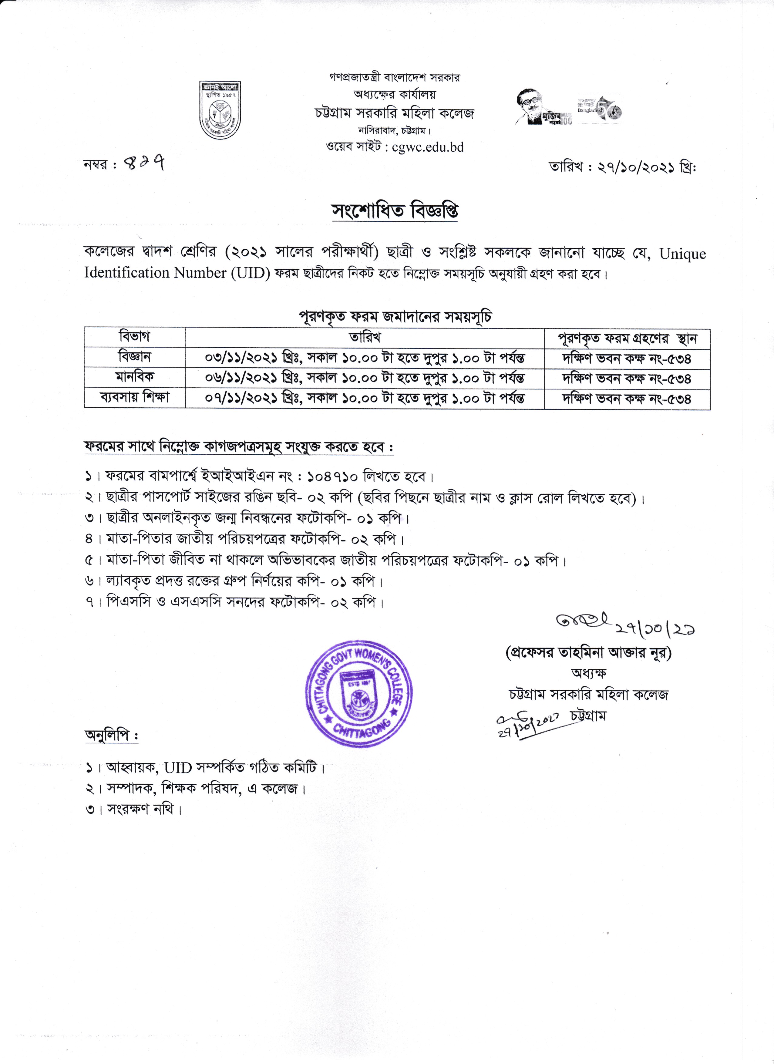দ্বাদশ শ্রেণি (২০২১ সালের পরীক্ষার্থী) ছাত্রীদের ইউনিক আইডি ফরম জমাদেয়ার সংশোধিত বিজ্ঞপ্তি (২৭/১০/২০২১)