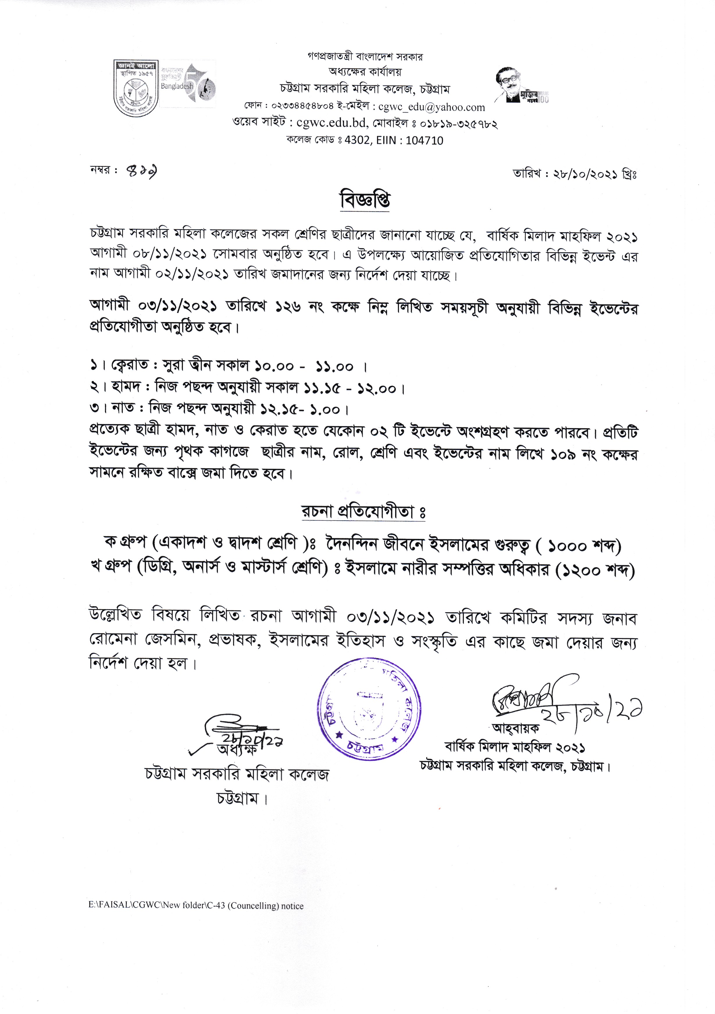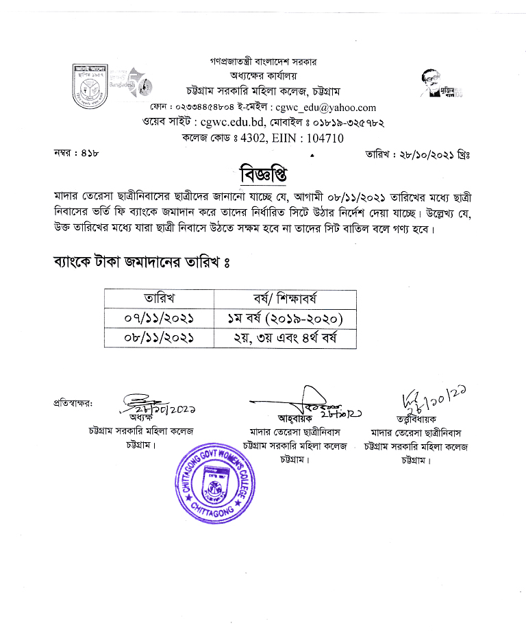 কলেজের মাদার তেরেসা ছাত্রীনিবাসে অবস্থানরত ছাত্রীদের ভর্তি ফি ব্যাংক জমাদানপূর্বক ছাত্রীনিবাসে উঠা সংক্রান্ত বিজ্ঞপ্তি প্রকাশ (২৮.১০.২০২১ খ্রিঃ)