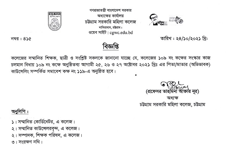 একাদশ শ্রেণির গত কাউন্সেলিং-এ অনুপস্থিত ছাত্রীদের অভিভাবক সমাবেশ ১০৯নং কক্ষের পরিবর্তে ১১৯নং কক্ষে অনুষ্ঠিত সংক্রান্ত বিজ্ঞপ্তি প্রকাশ (২৪.১০.২০২১ খ্রিঃ)