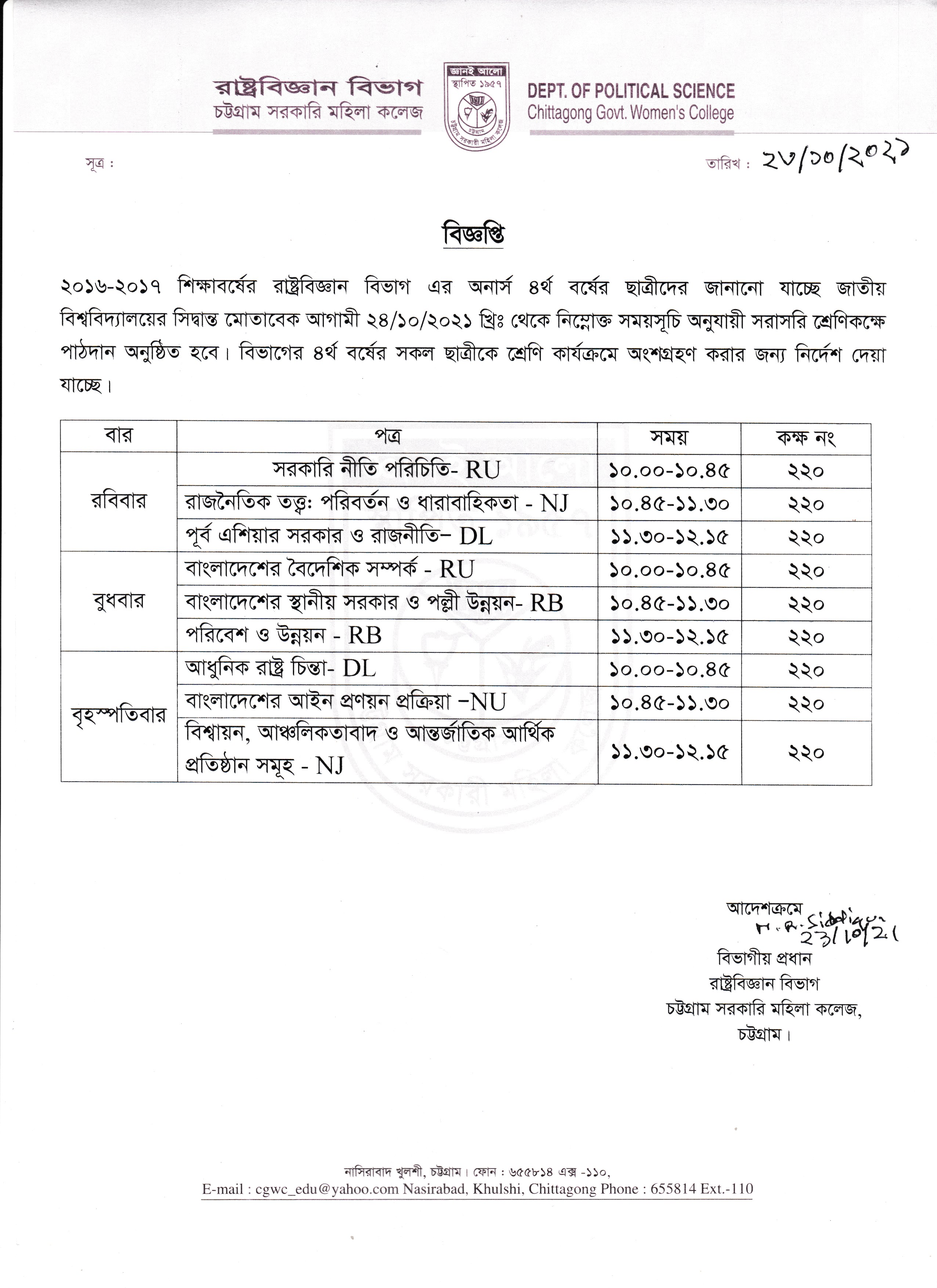 রাষ্ট্রবিজ্ঞান বিভাগের অনার্স ৪র্থবর্ষের (শিক্ষাবর্ষ ২০১৬-২০১৭) সরাসরি শ্রেণি কক্ষের পাঠদান সময়সূচি প্রকাশ (২৩/১০/২০২১)