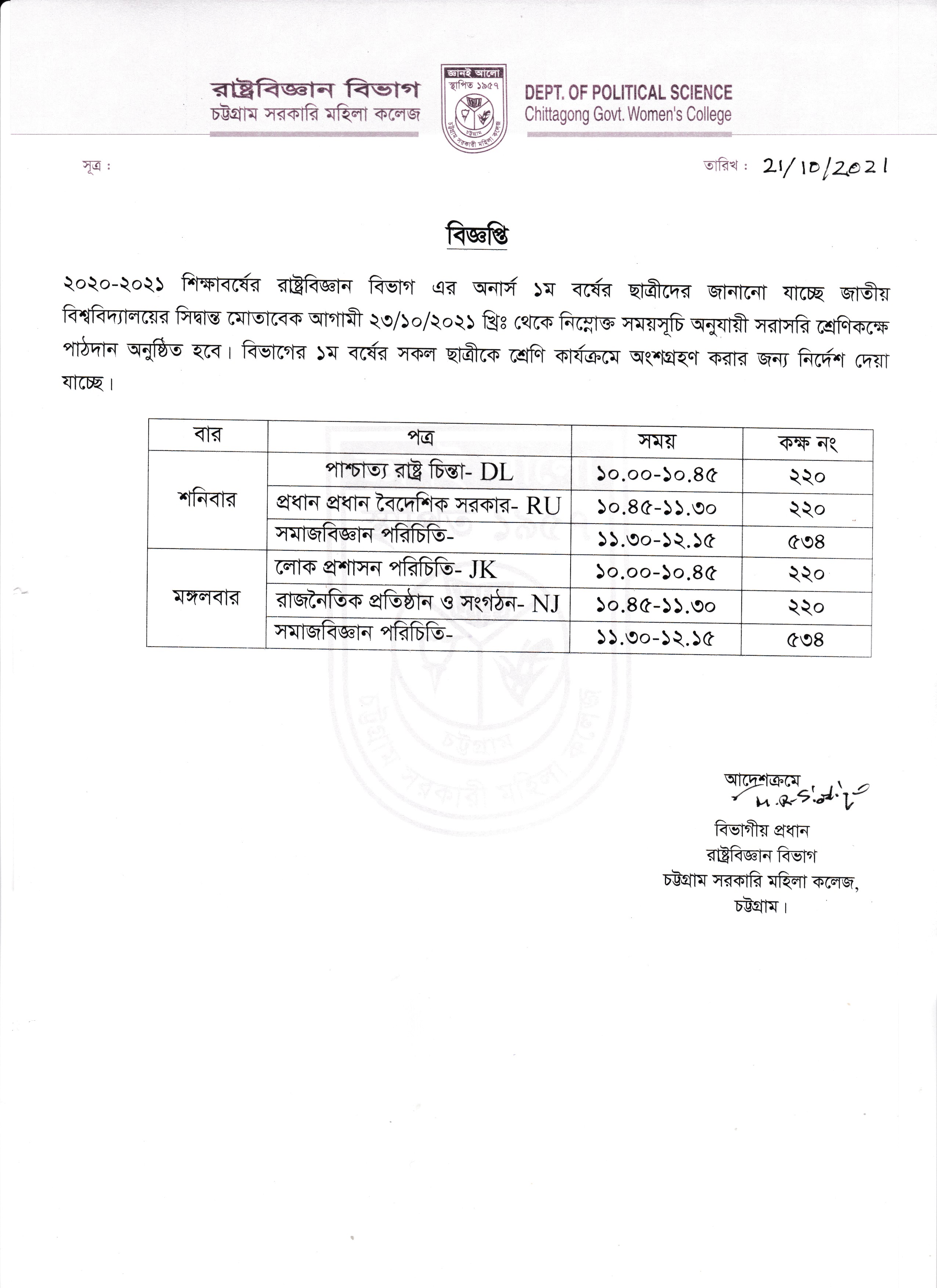 রাষ্ট্রবিজ্ঞান বিভাগের অনার্স ১ম বর্ষের (শিক্ষাবর্ষ ২০২০-২-২১) সরাসরি শ্রেণি কক্ষের পাঠদান সময়সূচি প্রকাশ (২১/১০/২০২১)