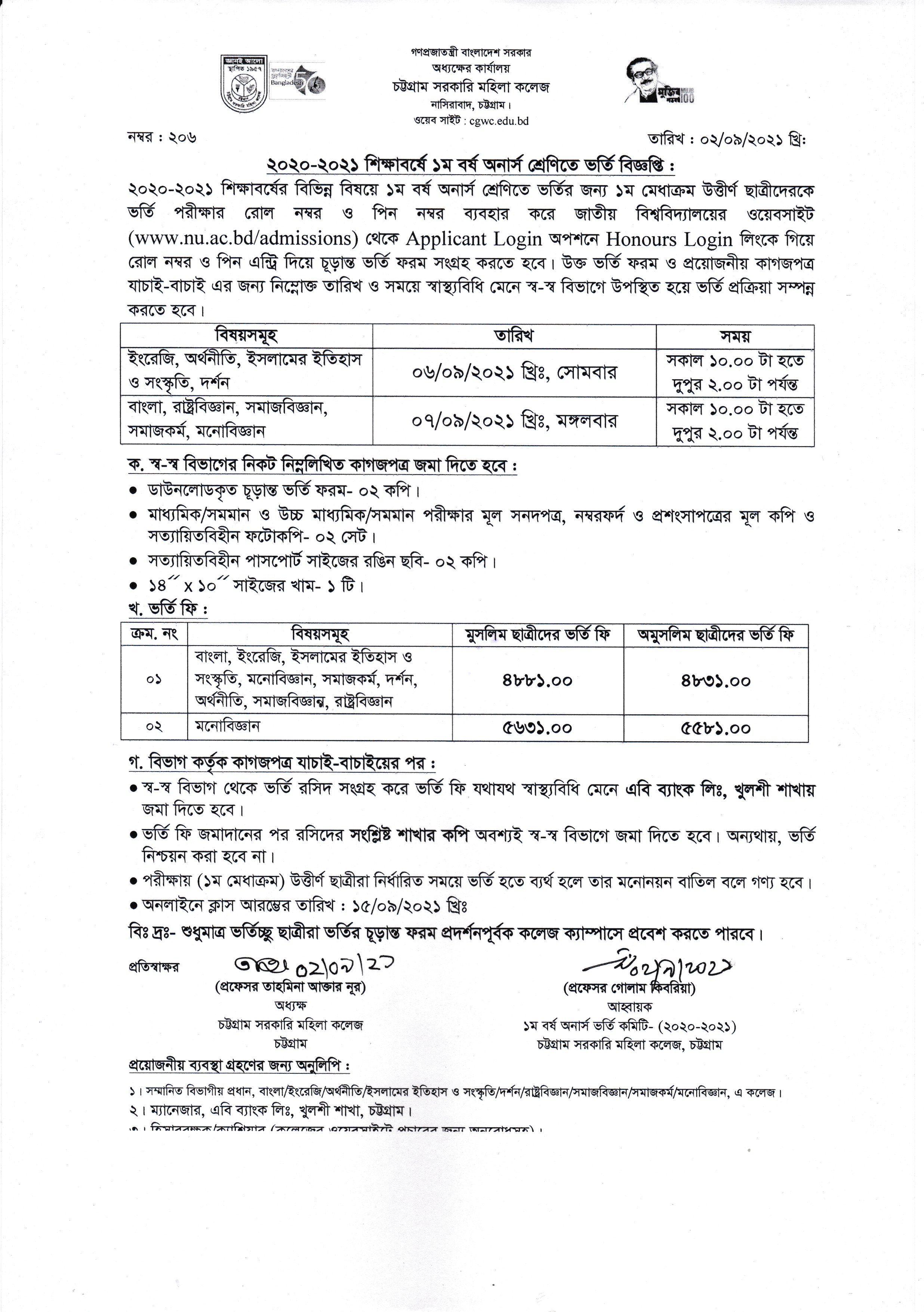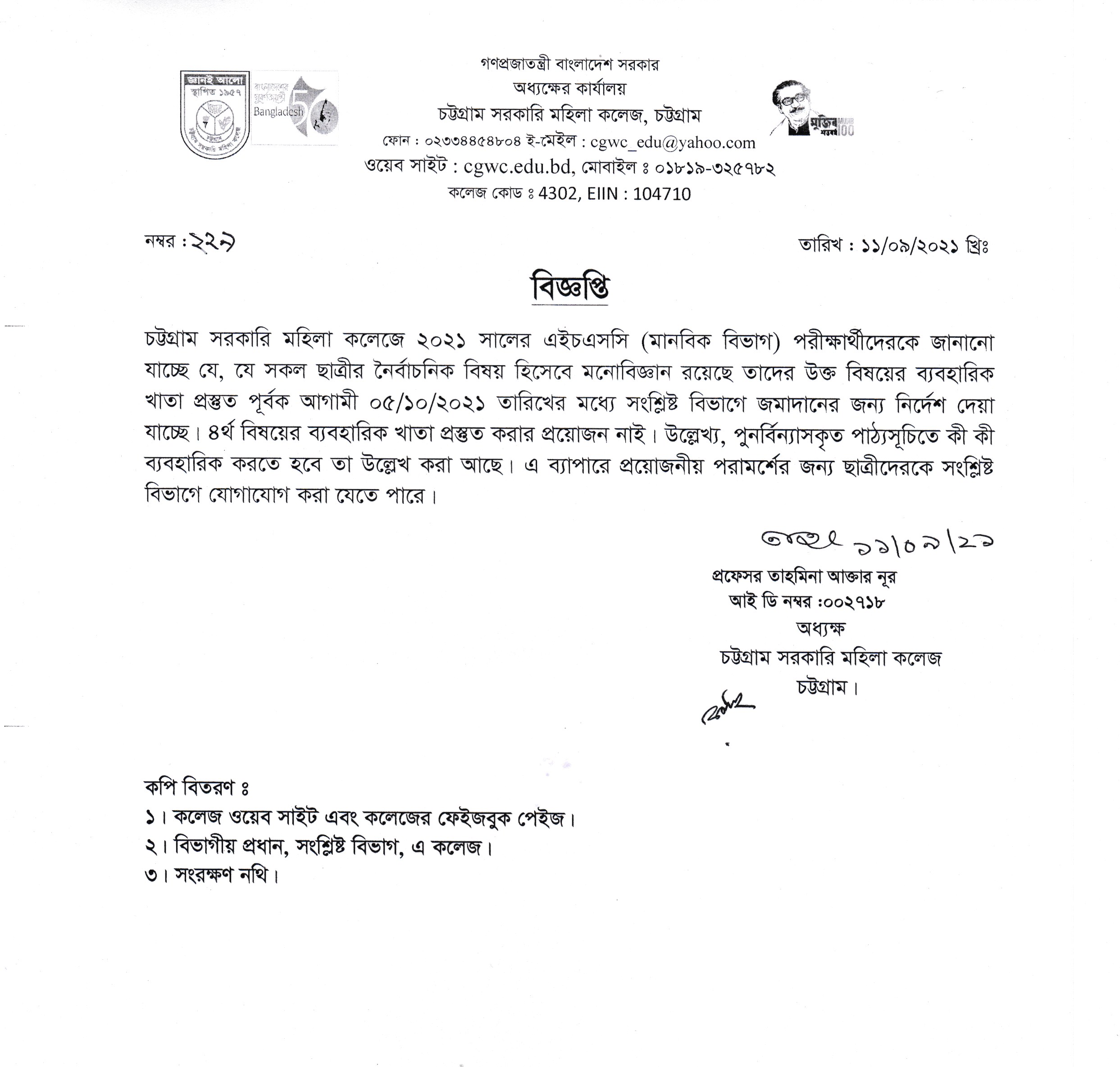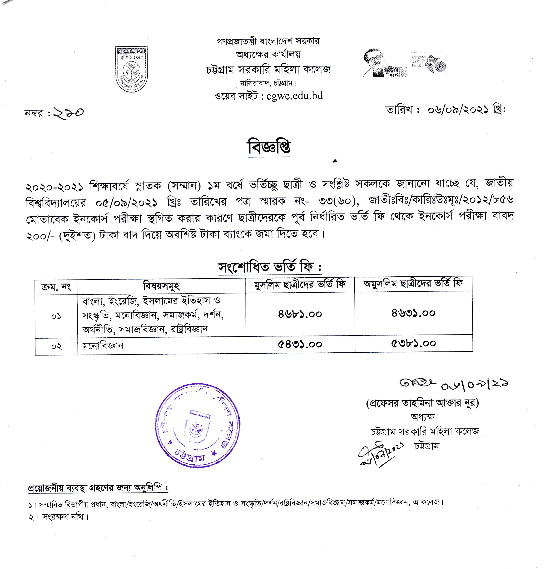 ২০২০-২০২১ শিক্ষাবর্ষে স্নাতক (সম্মান) ১ম বর্ষে ভর্তিচ্ছু ছাত্রীদের সংশোধিত ভর্তি ফি সংক্রান্ত বিজ্ঞপ্তি প্রকাশ (০৬.০৯.২০২১ খ্রিঃ)