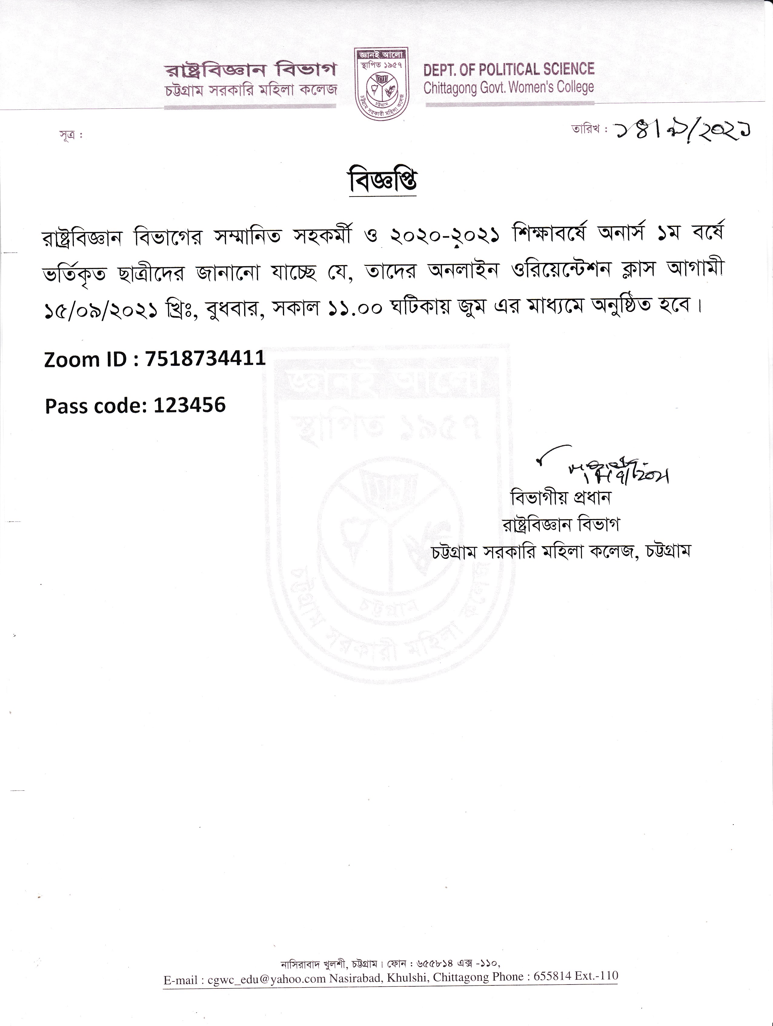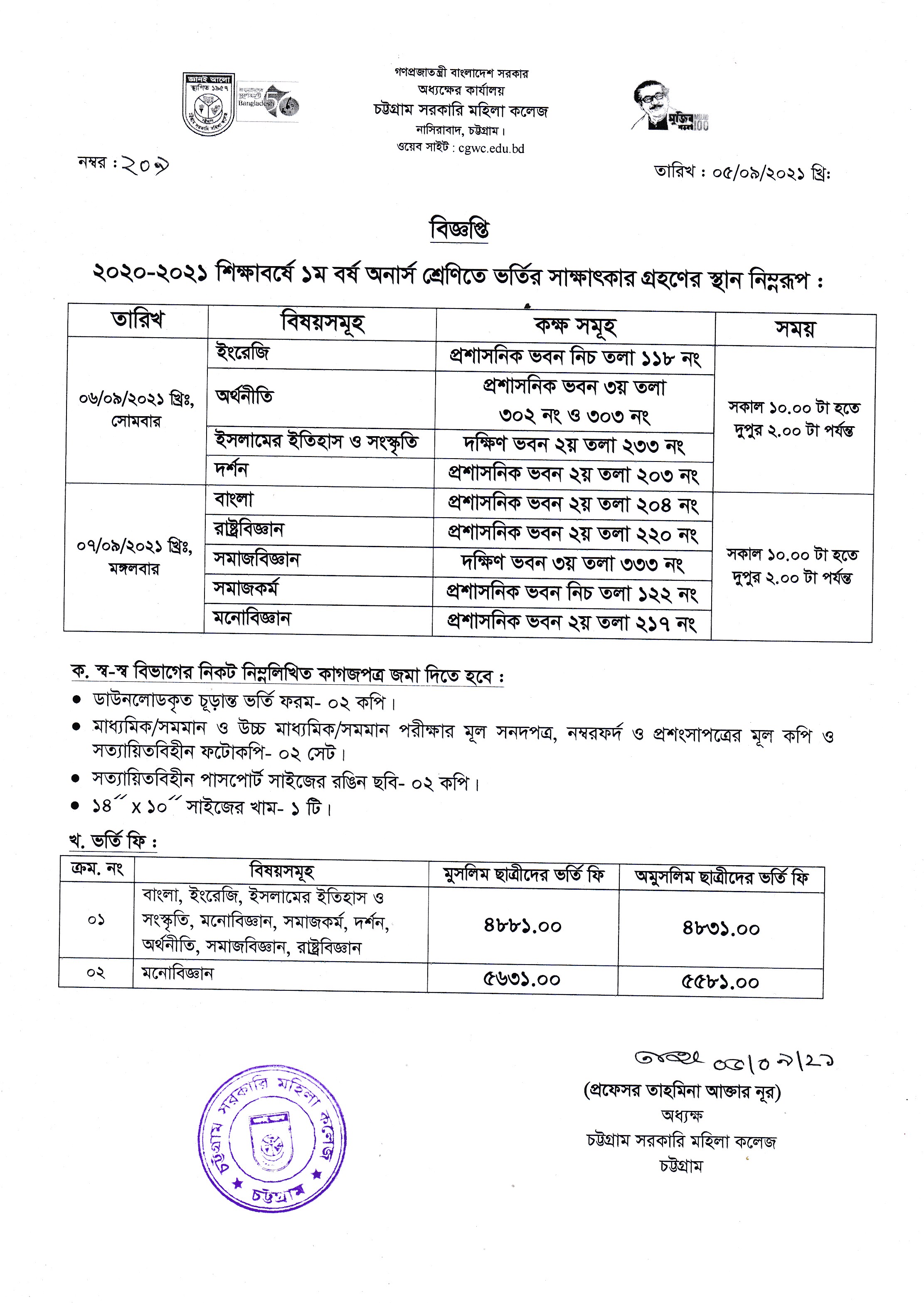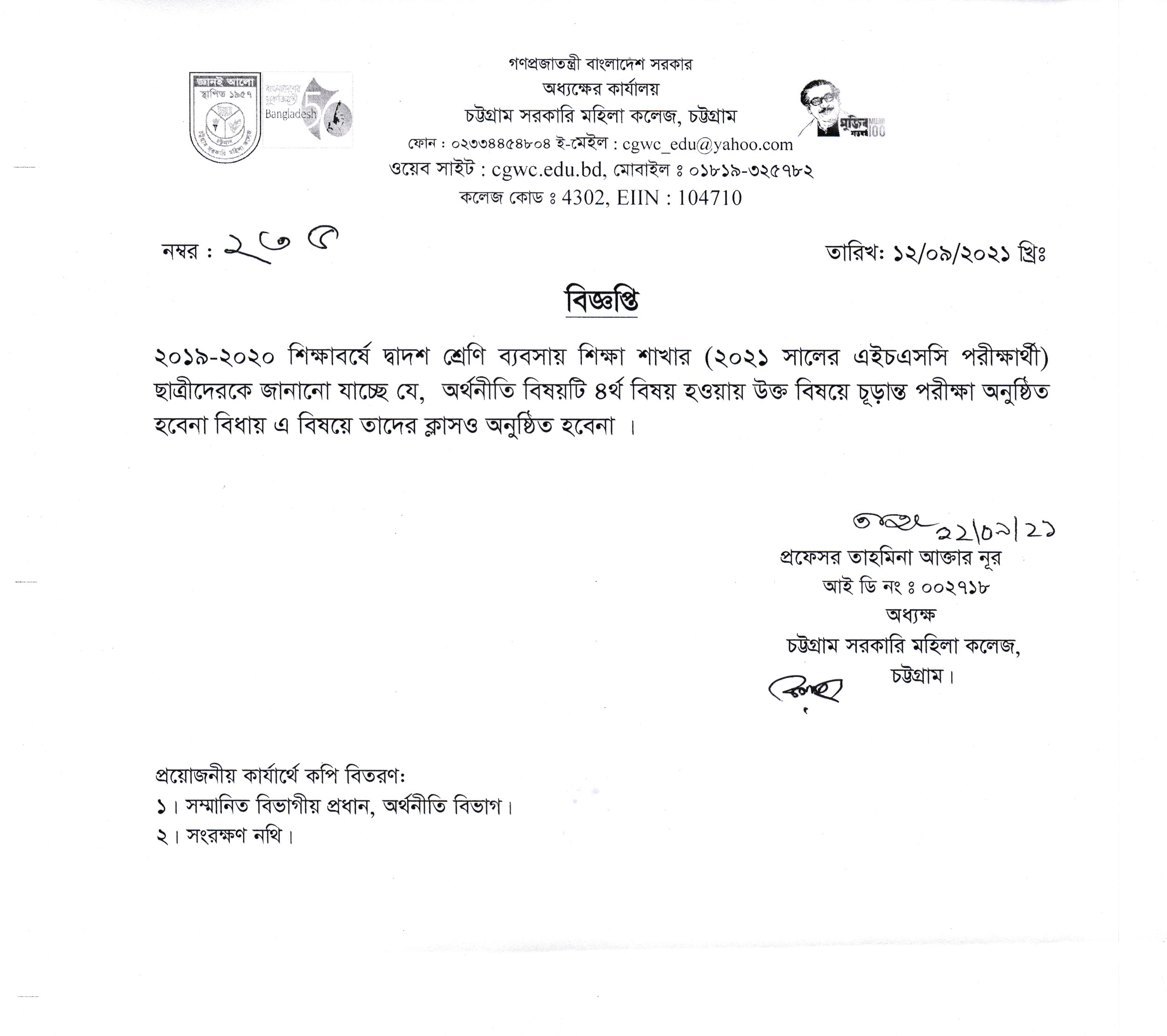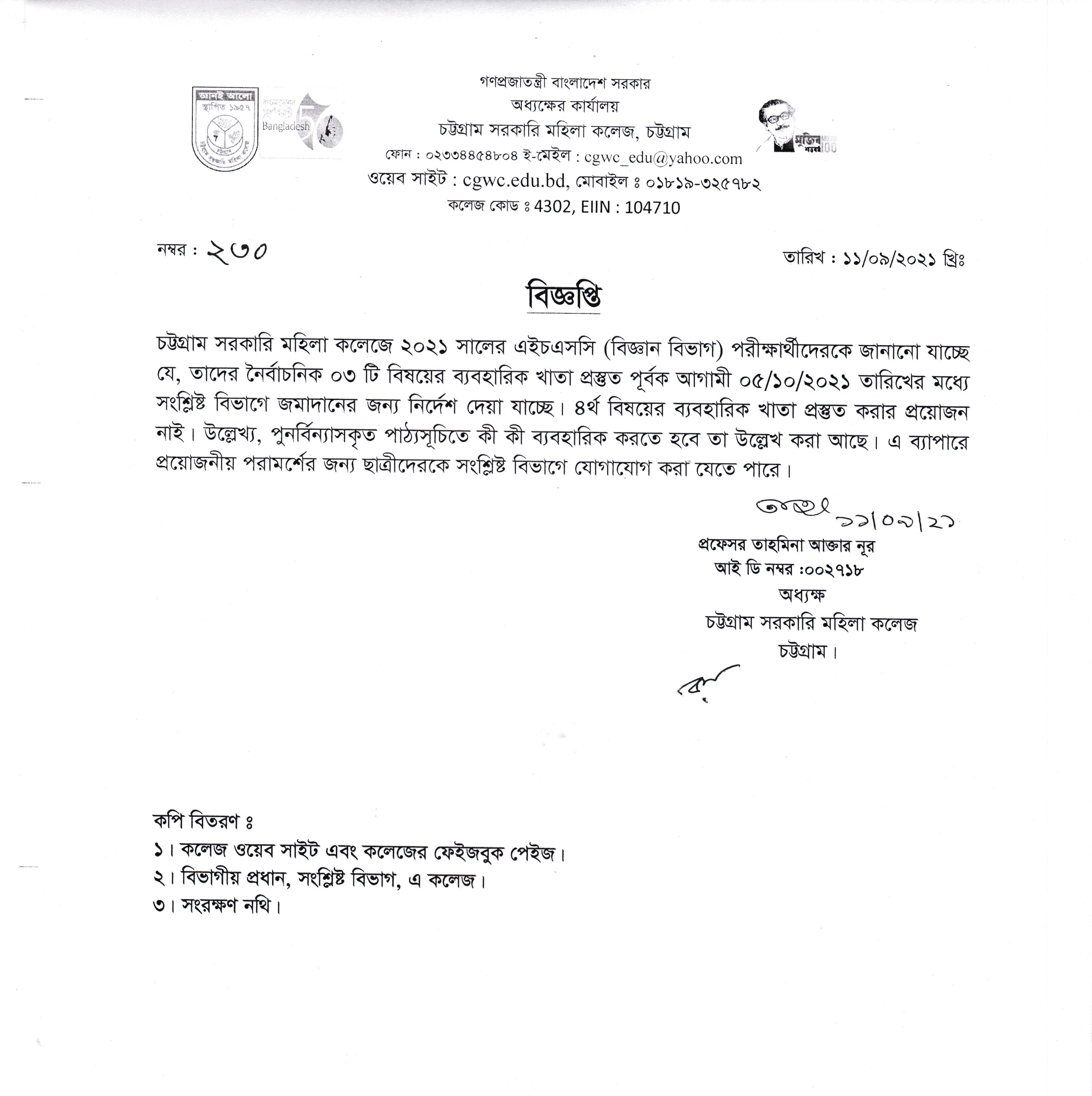 ২০২০-২০২১ শিক্ষাবর্ষে স্নাতক (সম্মান) ১ম বর্ষে ভর্তিচ্ছু ছাত্রীদের সংশোধিত ভর্তি ফি সংক্রান্ত বিজ্ঞপ্তি প্রকাশ (০৬.০৯.২০২১ খ্রিঃ)