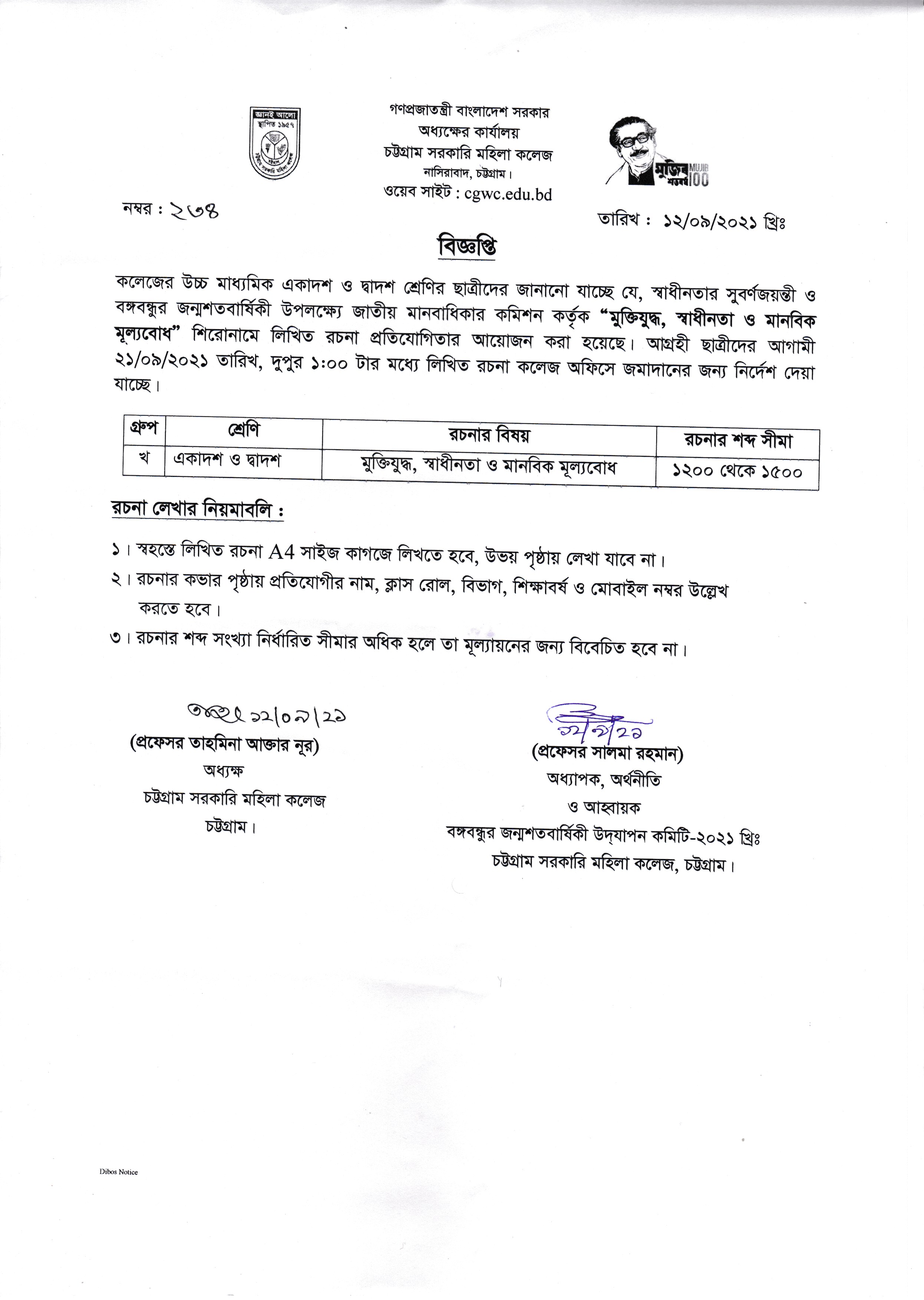 মুক্তিযুদ্ধ, স্বাধীনতা ও মানবিক মূল্যবোধ শিরোনামে লিখিত রচনা প্রতিযোগিতার বিজ্ঞপ্তি প্রকাশ (১২/০৯/২০২১)
