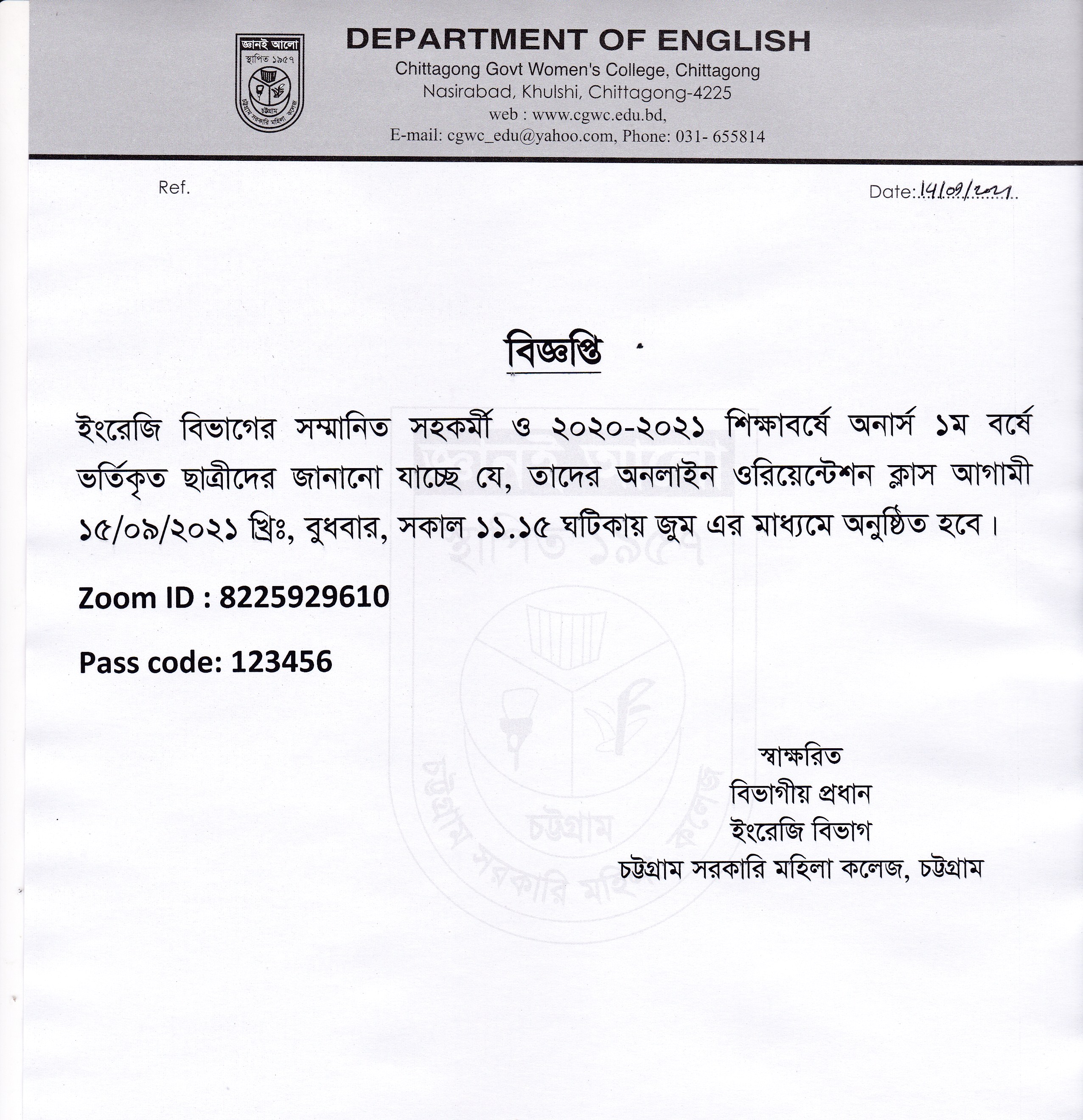 ইংরেজি বিভাগের অনার্স ১ম বর্ষ (শিক্ষাবর্ষ : ২০২০-২০২১) এর ওরিয়েন্টেশন ক্লাসের সময়সূচি প্রকাশ (১৪.০৯.২০২১ খ্রিঃ)