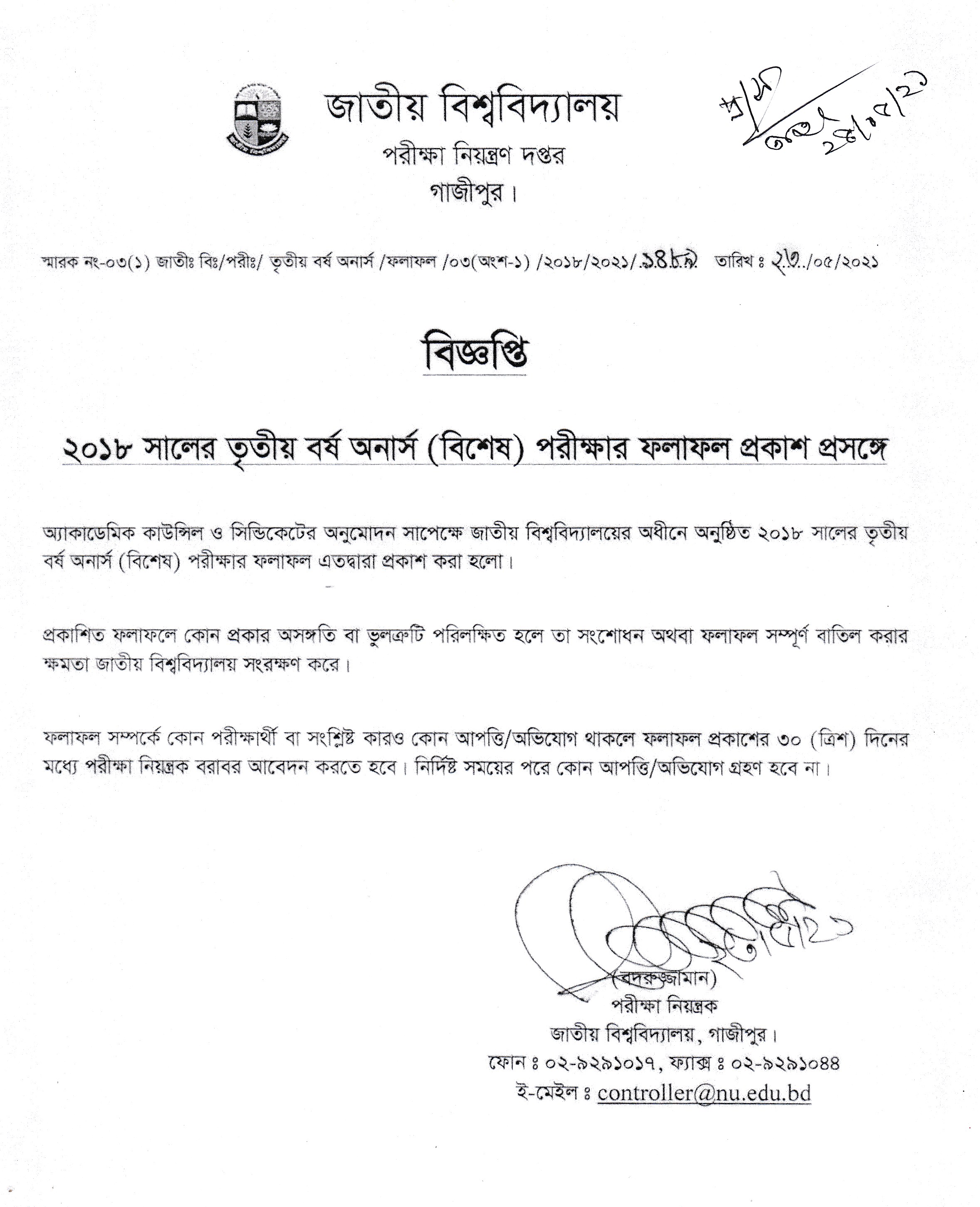 ২০১৮ সালের অনার্স ৩য় বর্ষ (বিশেষ) পরীক্ষার ফলাফল প্রকাশ সংক্রান্ত (২৯.০৫.২০২১ খ্রিঃ)