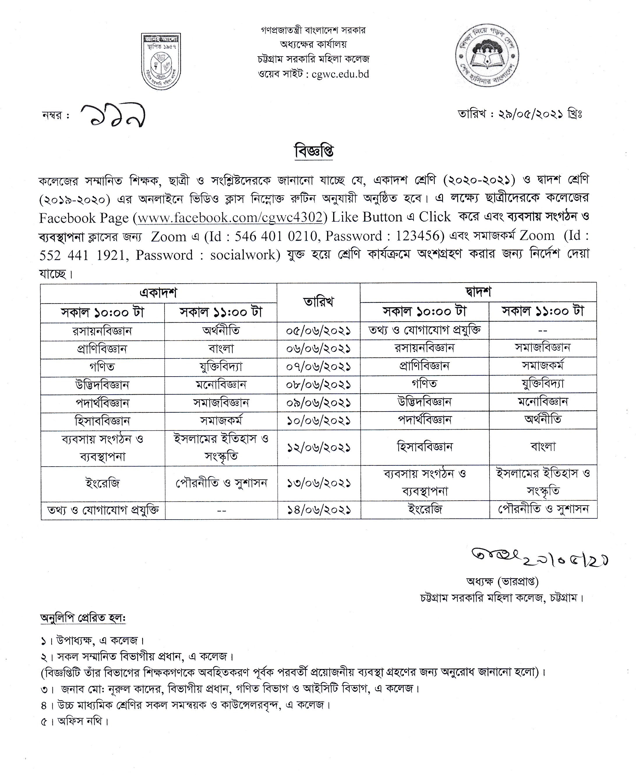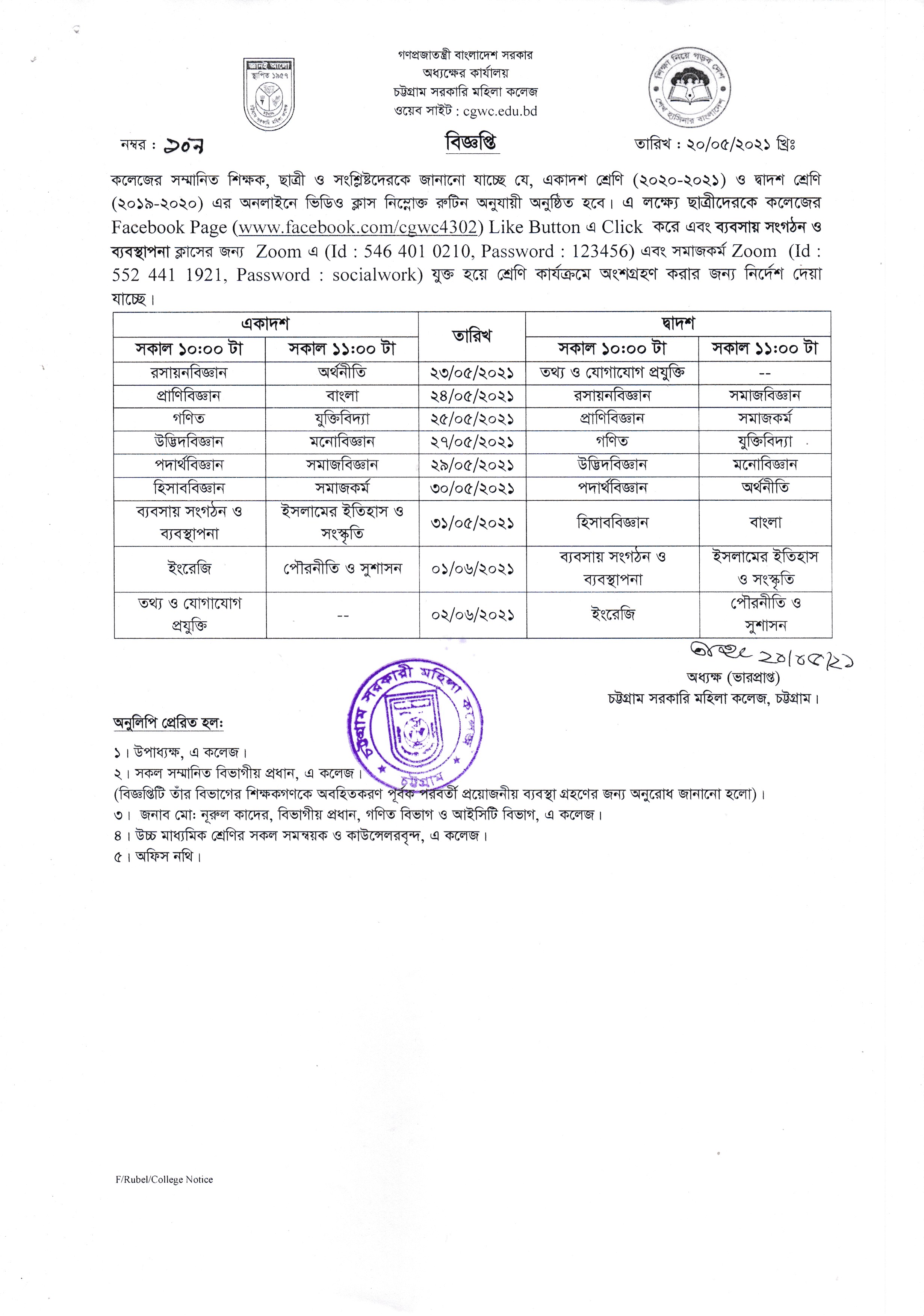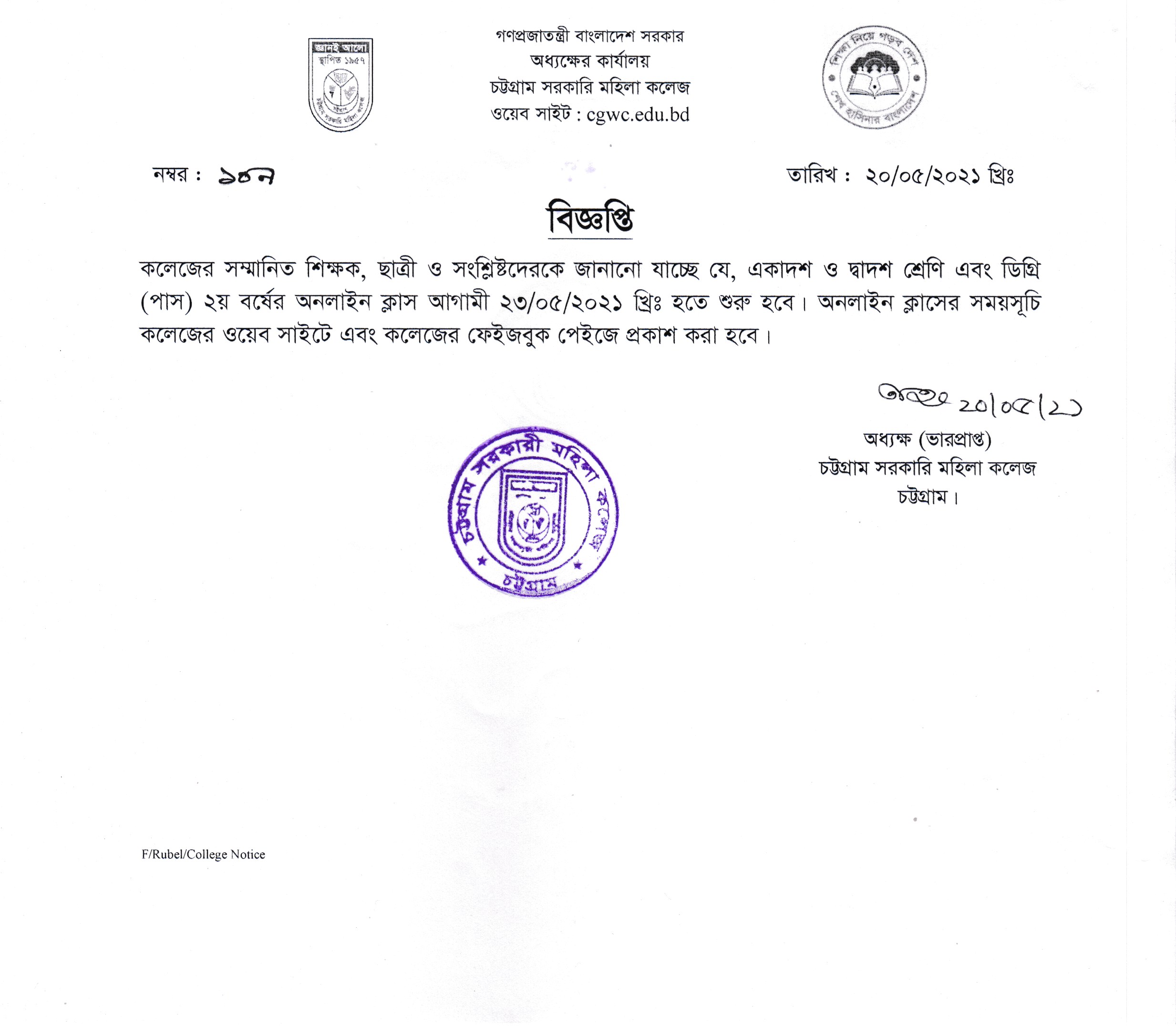 একাদশ ও দ্বাদশ শ্রেণি এবং ডিগ্রি (পাস) শ্রেণির ছাত্রীদের অনলাইন ক্লাসের বিজ্ঞপ্তি প্রকাশ (২০/০৫/২০২১)