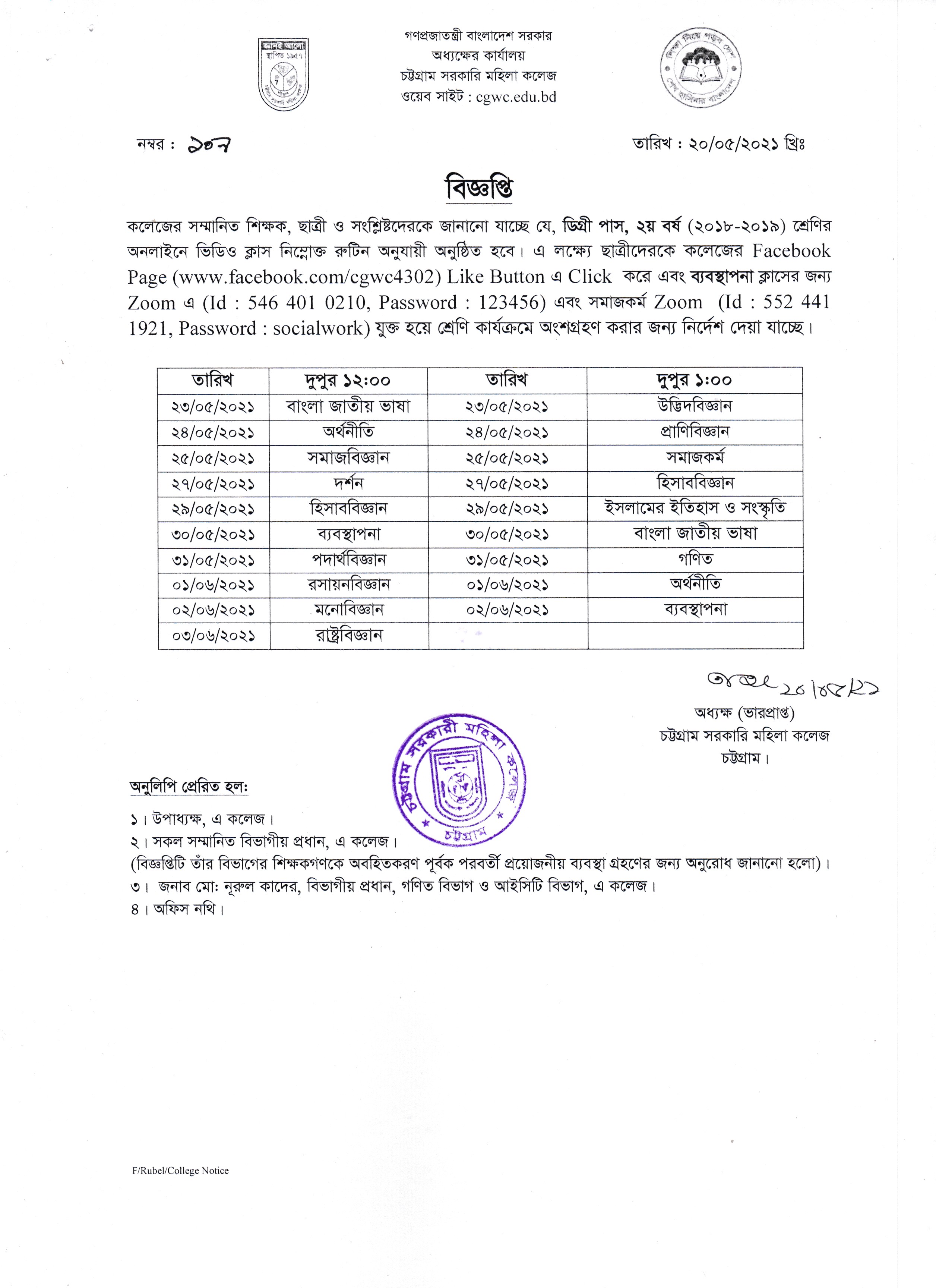২০১৮-২০১৯ শিক্ষাবর্ষের ডিগ্রী (পাস) ২য় বর্ষ অনলাইনে ভিডিও এবং জুম ক্লাসের রুটিন প্রকাশ (২৯/০৫/২০২১ খ্রিঃ)