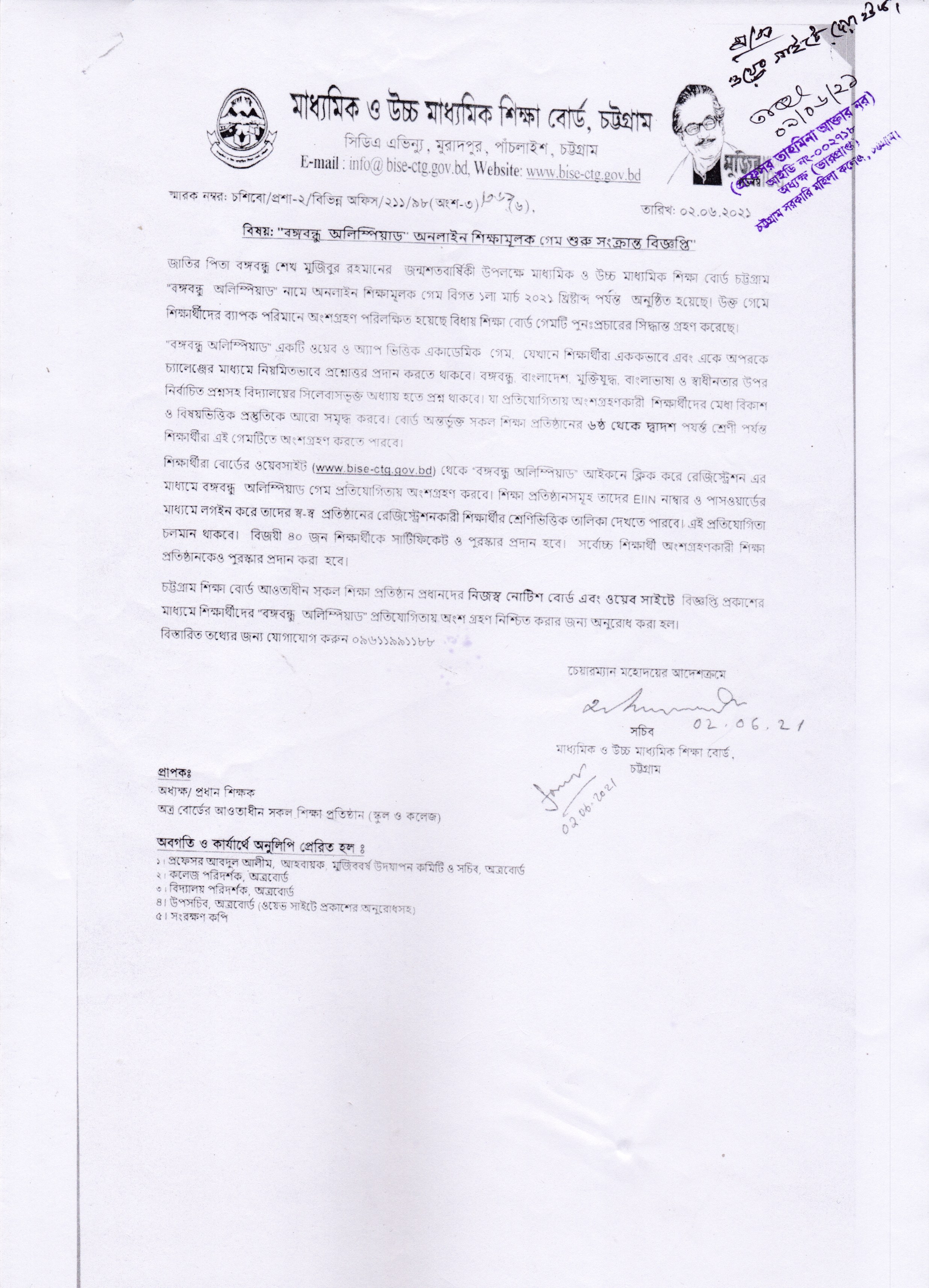 বঙ্গবন্ধু অলিম্পিয়াড় অনলাইন শিক্ষামূলক গেম শুরু সংক্রান্ত বিজ্ঞপ্তি।