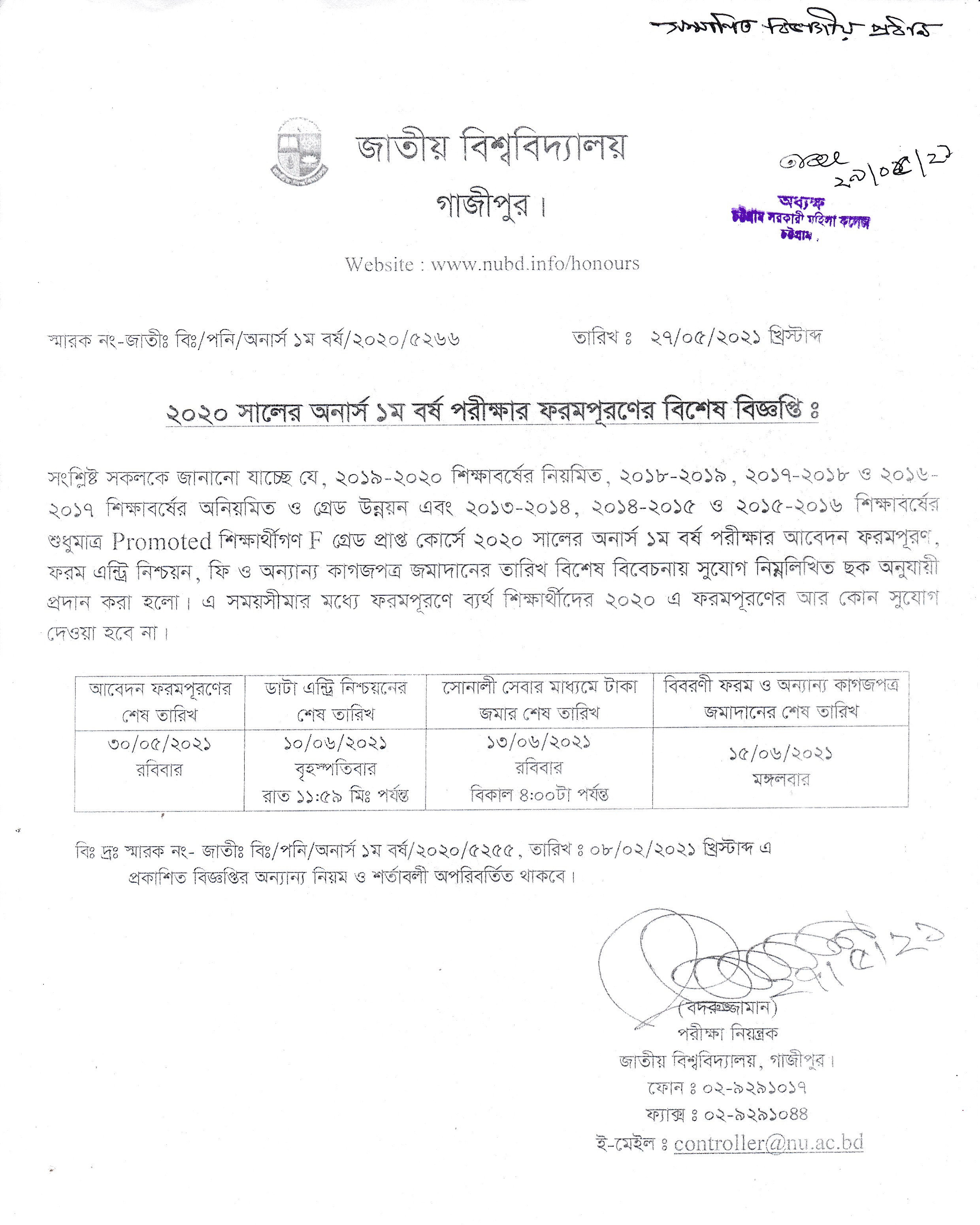 ২০২০ সালের অনার্স ১ম বর্ষ পরীক্ষার ফরম পূরণের বিশেষ বিজ্ঞপ্তি প্রকাশ (২৯.০৫.২০২১ খ্রিঃ)