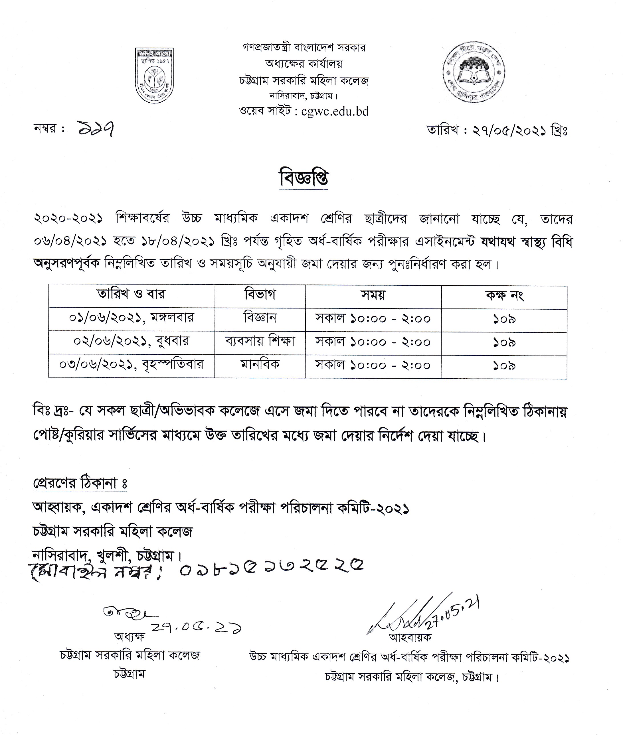 ২০২০-২০২১ শিক্ষাবর্ষের উচ্চ মাধ্যমিক একাদশ শ্রেণির গৃহিত অর্ধ-বার্ষিক পরীক্ষার এসাইনমেন্ট জমা দেয়া সংক্রান্ত বিজ্ঞপ্তি প্রকাশ (২৭.০৫.২০২১ খ্রিঃ)