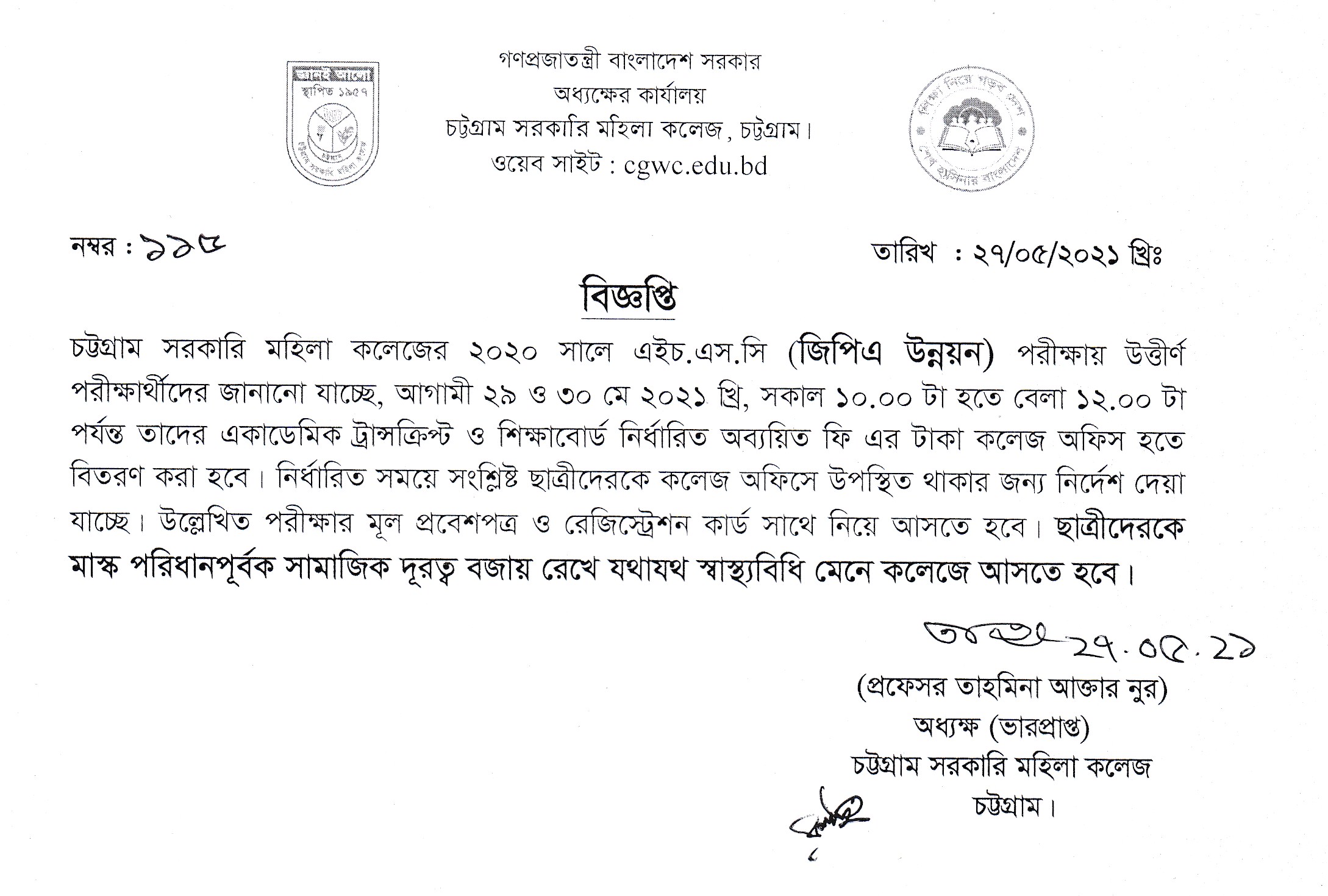 ২০২০ সালের এইচ.এস.সি (জিপিএ উন্নয়ন) পরীক্ষায় উত্তীর্ণ পরীক্ষার্থীদের একাডেমিক ট্রান্সক্রিপ্ট, শিক্ষাবোর্ড নির্ধারিত অব্যয়িত ফি কলেজ অফিস হতে সংগ্রহ করার বিজ্ঞপ্তি প্রকাশ (২৭.০৫.২০২১ খ্রিঃ)
