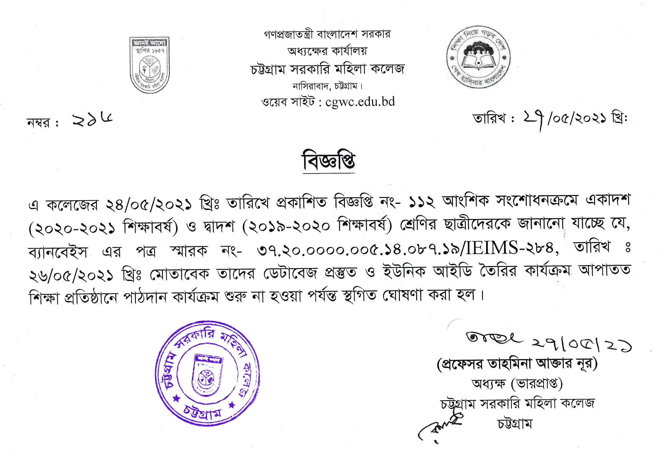 কলেজের একাদশ ও দ্বাদশ শ্রেণির ছাত্রীদের তাদের ডাটাবেজ প্রস্তুত ও ইউনিক আইডি তৈরির কার্যক্রম আপাতত স্থগিত সংক্রান্ত বিজ্ঞপ্তি প্রকাশ (২৭.০৫.২০২১ খ্রিঃ)