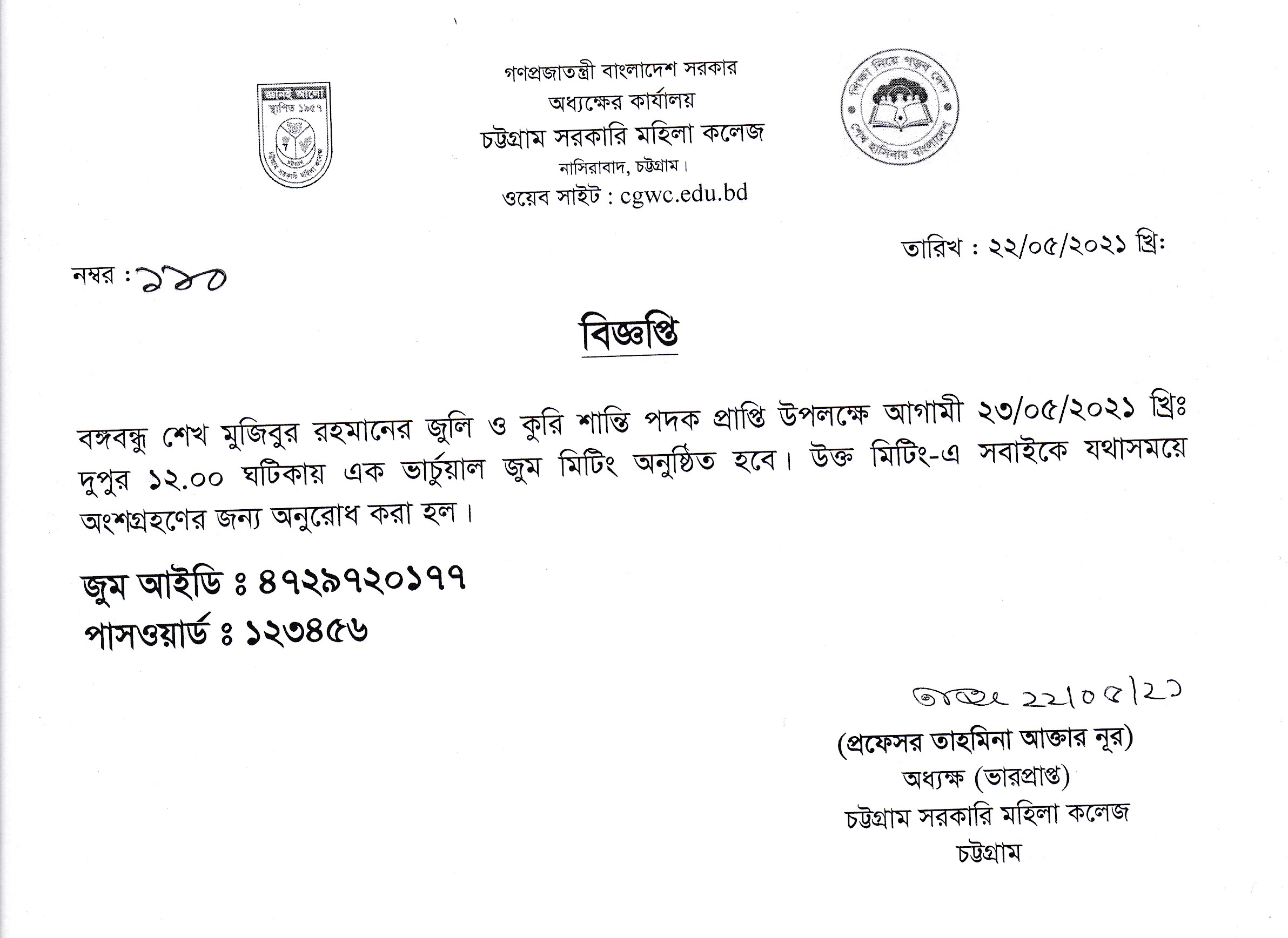 বঙ্গবন্ধু শেখ মুজিবুর রহমান-এর জুলি ও কুরি শান্তি পদক প্রাপ্তি উপলক্ষে আগামী ২৩/০৫/২০২১ খ্রিঃ দুপুর ১২.০০ ঘটিকায় এক ভার্চুয়াল জুম মিটিং অনুষ্ঠিত হবে।