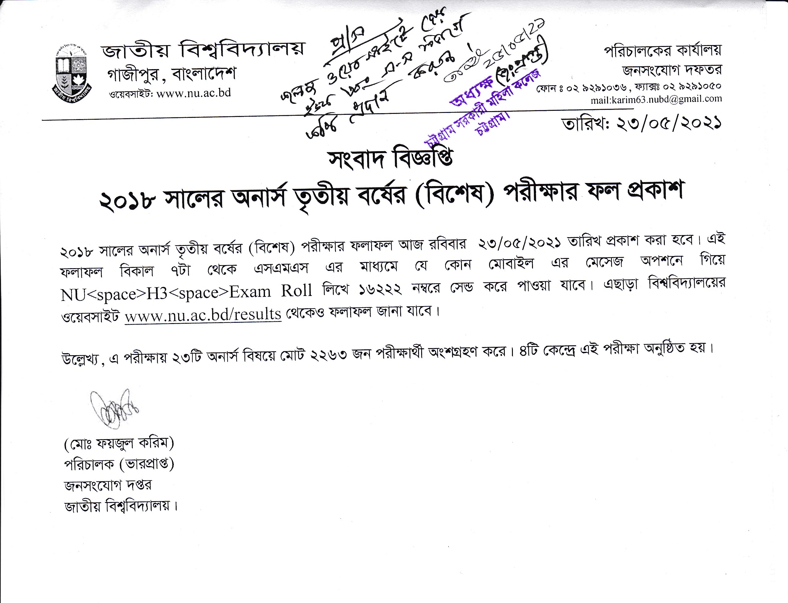 ২০১৮ সালের অনার্স ৩য় বর্ষের (বিশেষ) পরীক্ষার ফল প্রকাশ (২৫.০৫.২০২১ খ্রিঃ)