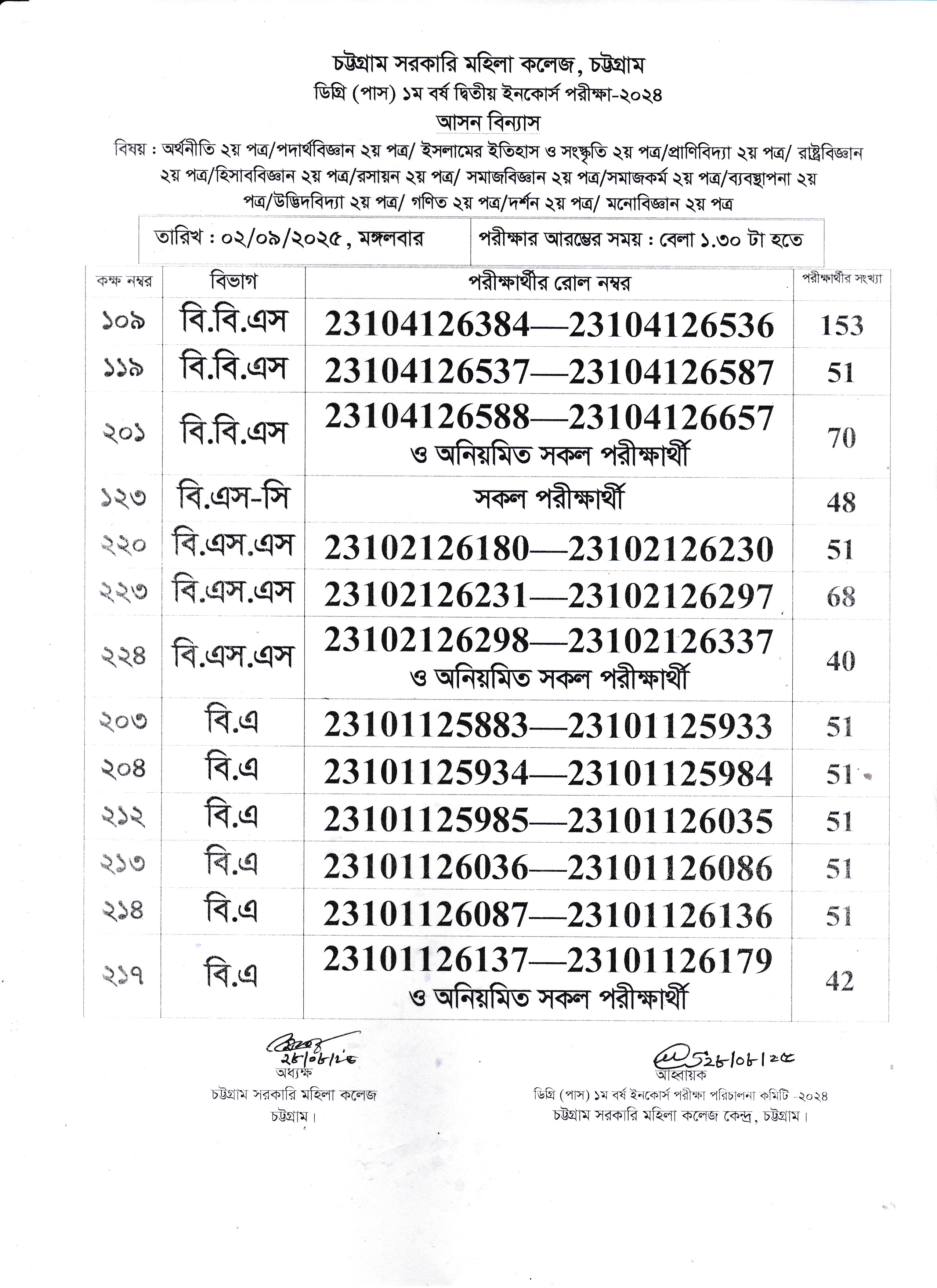 আগামী ০২/০৯/২০২৫ খ্রি. ডিগ্রী (পাস) ১ম বর্ষের দ্বিতীয় ইনকোর্স পরীক্ষার আসন বিন্যাস