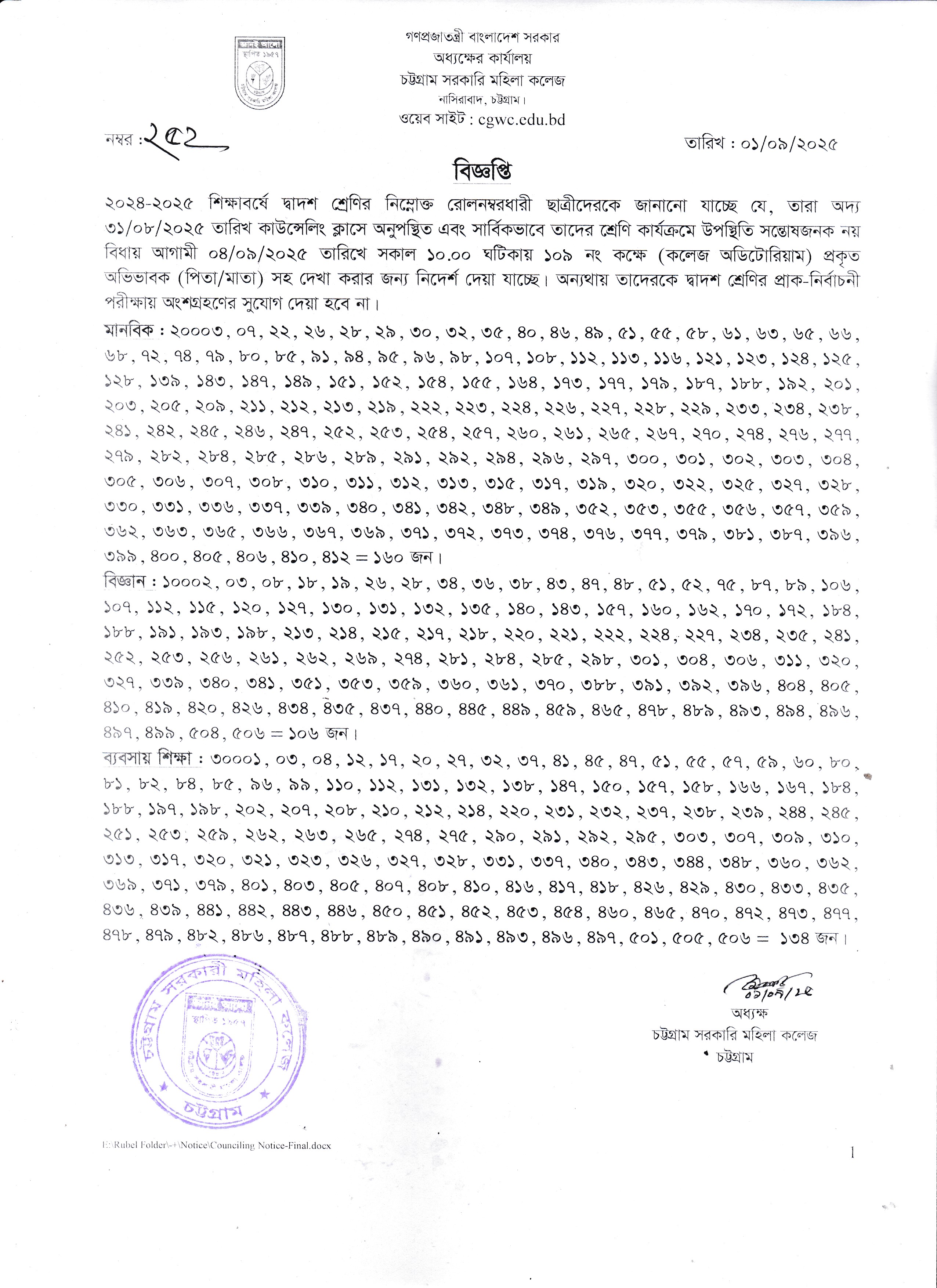 অদ্য ৩১/০৮/২০২৫ তারিখের কাউন্সেলিং এর দায়িত্ব পালন সংক্রান্ত বিজ্ঞপ্তি