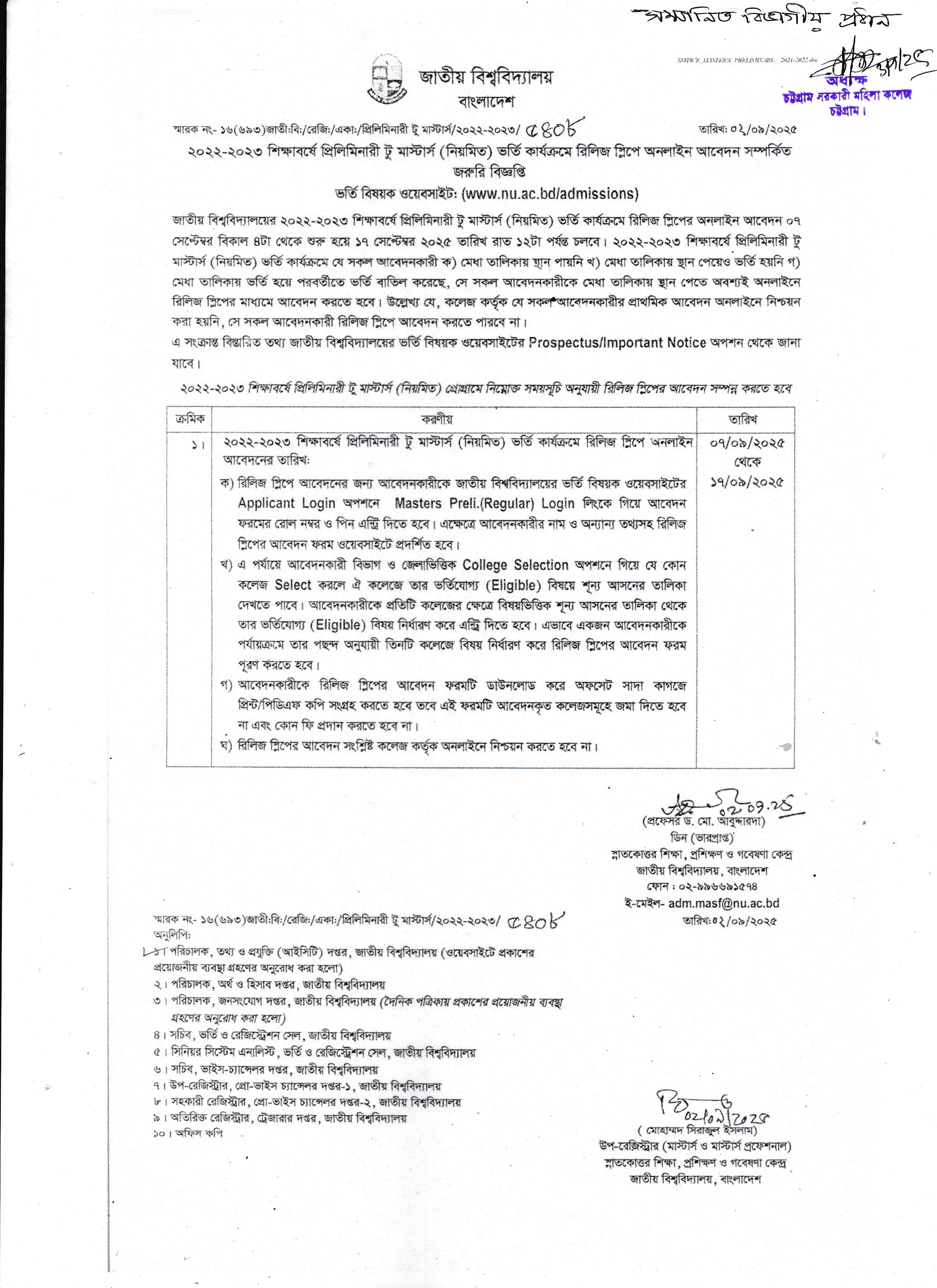 ২০২২-২০২৩ শিক্ষাবর্ষে প্রিলিমিনারি টু মাস্টার্স ভর্তির রিলিজ স্লিপে আবেদন সংক্রান্ত বিজ্ঞপ্তি