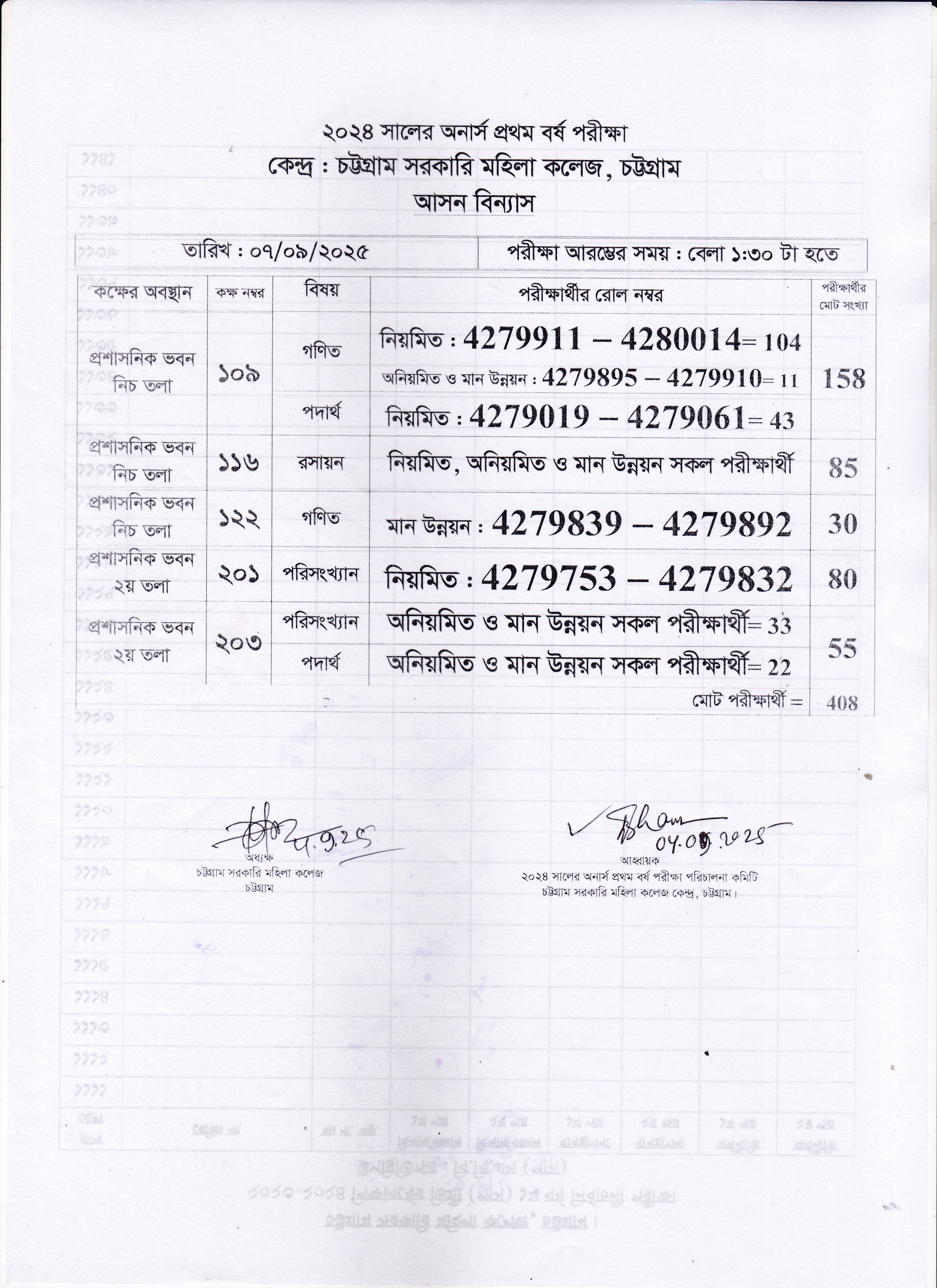 আগামী ০৭/০৯/২০২৫ তারিখের ২০২৪ সালের অনার্স ১ম বর্ষ পরীক্ষার আসন বিন্যাস