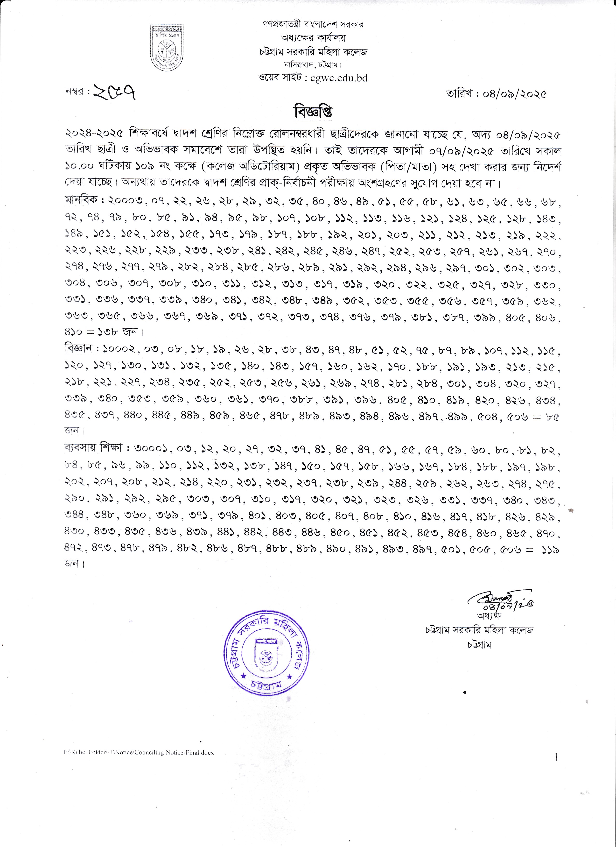 ২০২৫-২০২৬ শিক্ষাবর্ষে চট্টগ্রাম সরকারি মহিলা কলেজে একাদশ শ্রেণিতে ভর্তির জন্য মনোনীত শিক্ষার্থীদের ভর্তি বিজ্ঞপ্তি