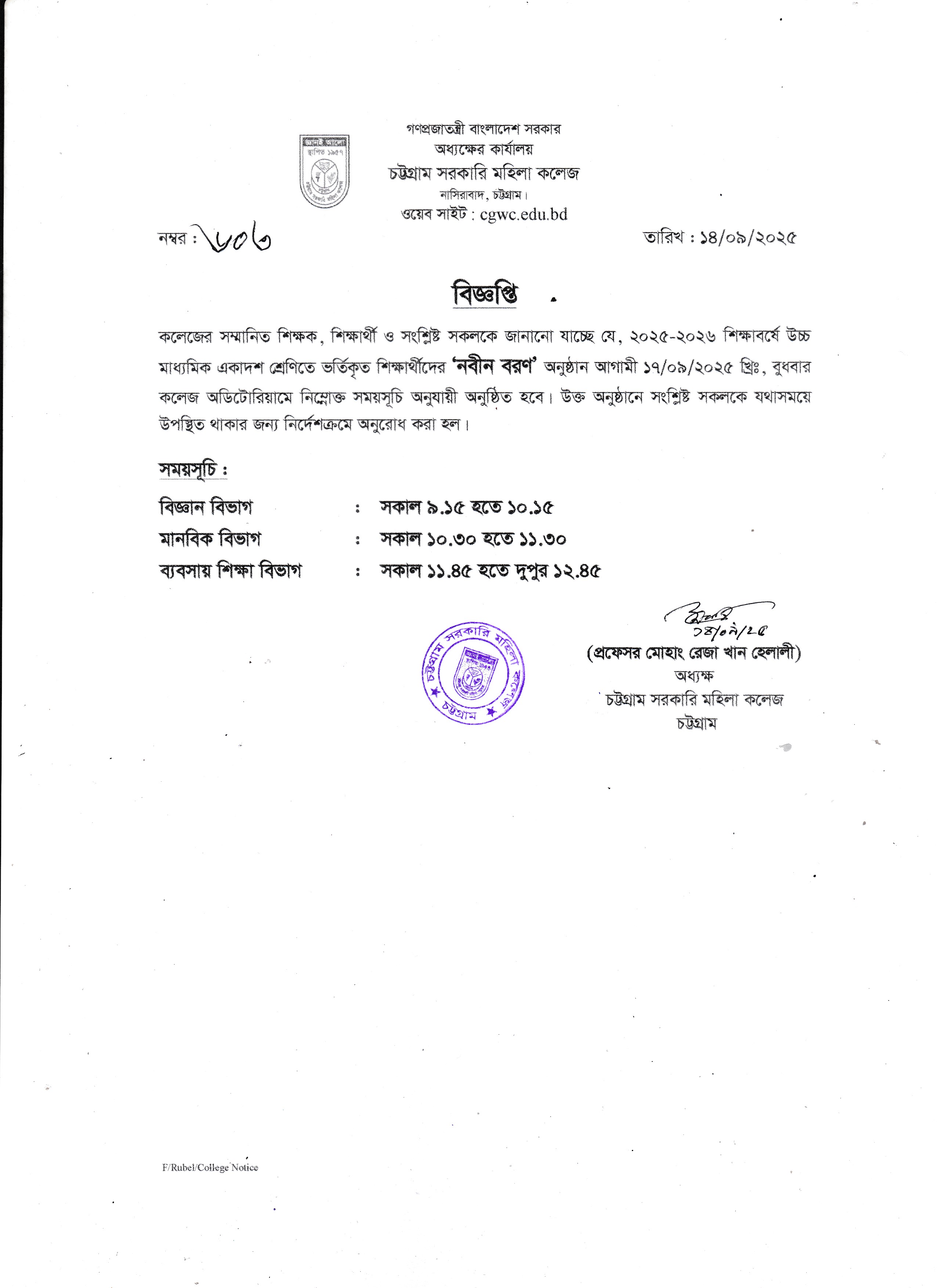 ২০২৫-২০২৬ শিক্ষাবর্ষে একাদশ শ্রেণিতে ভর্তিকৃত ছাত্রীদের নবীন বরণ অনুষ্ঠান সংক্রান্ত বিজ্ঞপ্তি