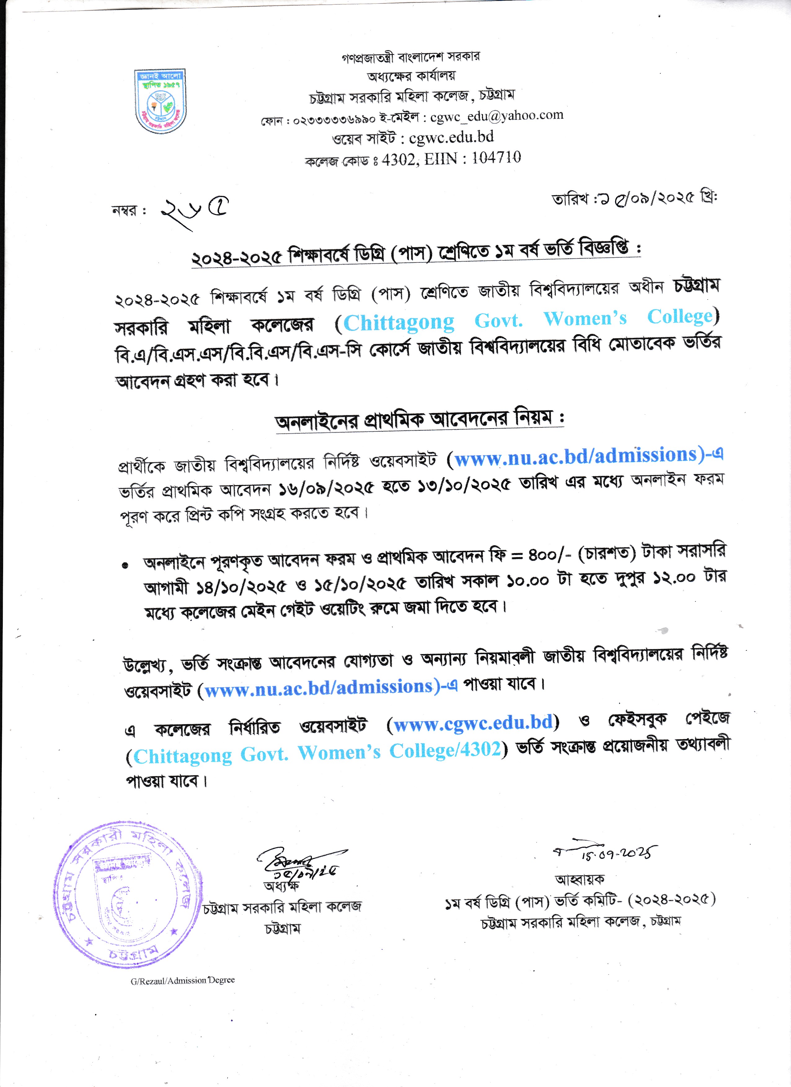 ২০২৪-২০২৫ শিক্ষাবর্ষে ডিগ্রি (পাস) ১ম বর্ষে ভর্তির প্রাথমিক আবেদন সংক্রান্ত বিজ্ঞপ্তি