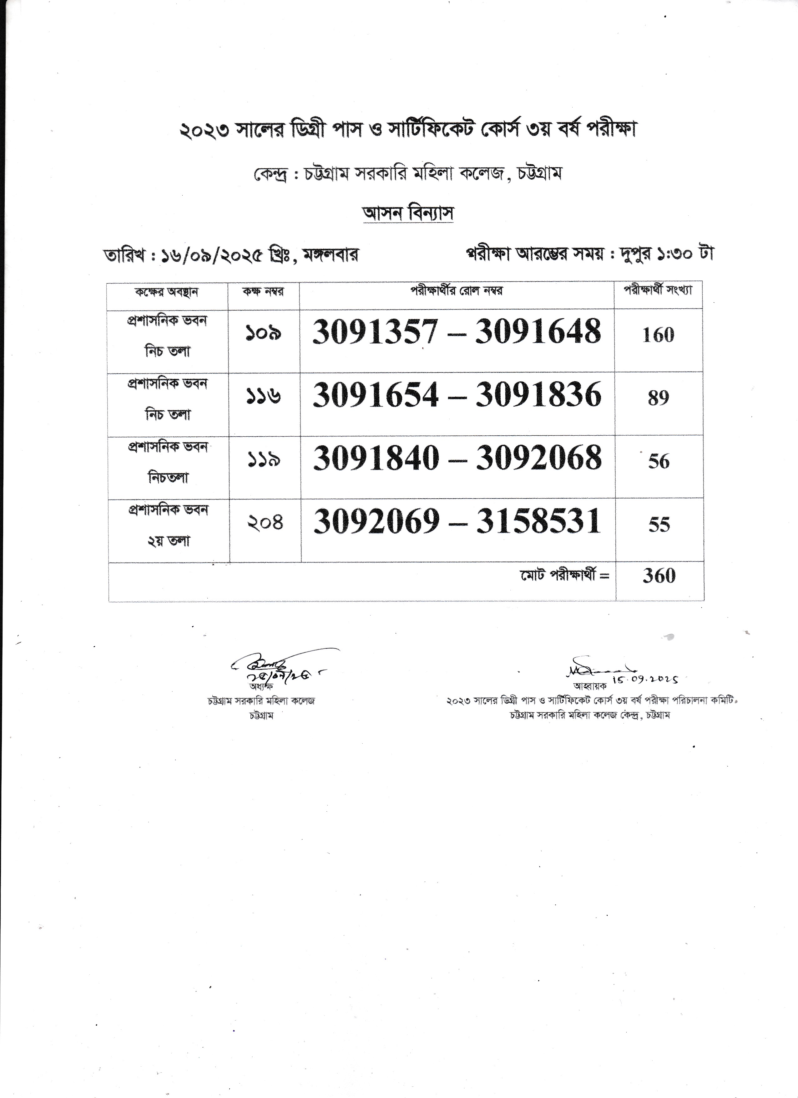 ২০২৩ সালের ডিগ্রি (পাস) ও সার্টিফিকেট কোর্স পরীক্ষার আগামী ১৬/০৯/২০২৫ তারিখের আসন বিন্যাস।
