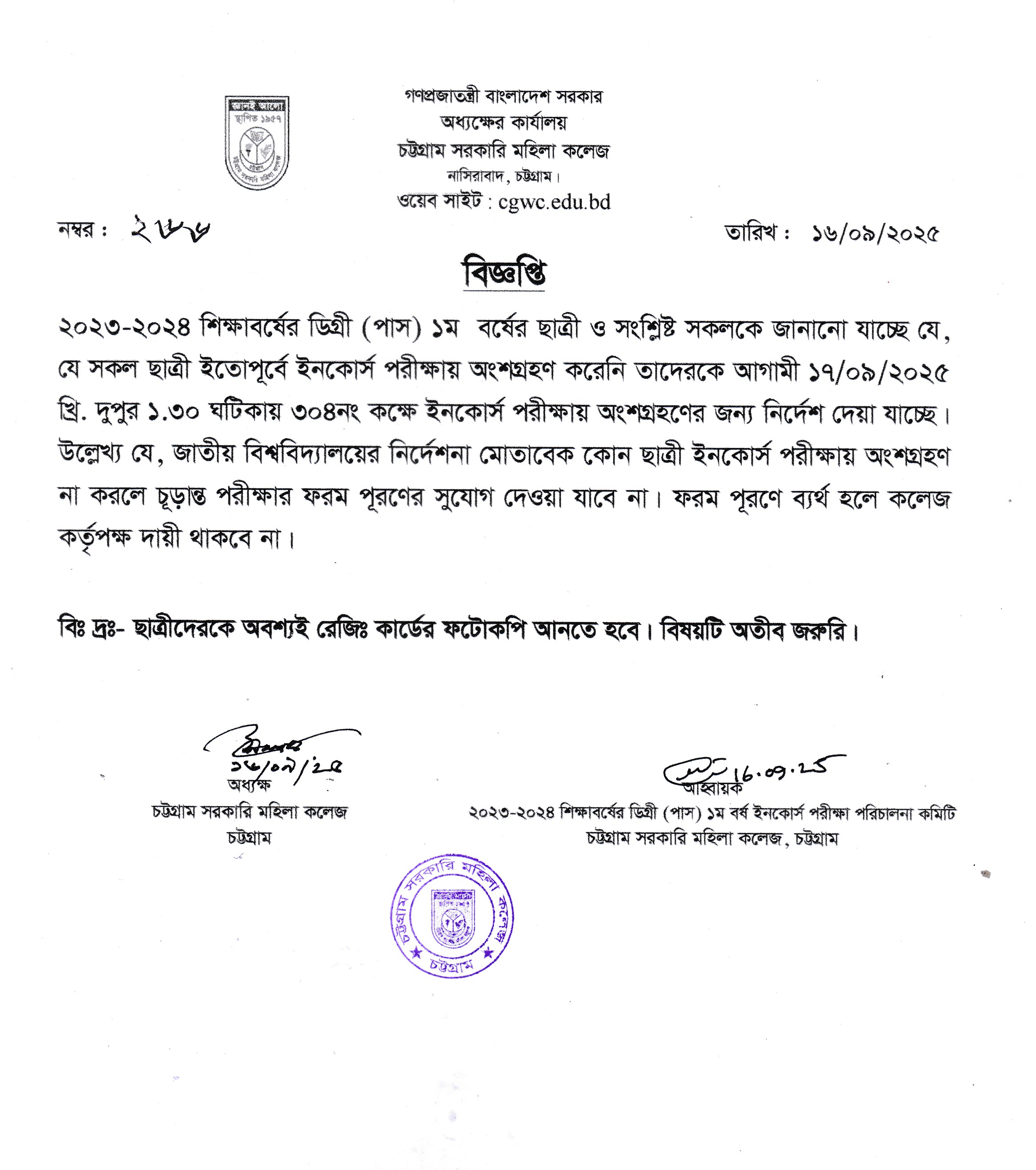 ২০২৩-২০২৪ শিক্ষাবর্ষের ডিগ্রী (পাস) ১ম বর্ষের ইনকোর্স পরীক্ষায় অংশগ্রহণ সংক্রান্ত বিজ্ঞপ্তি