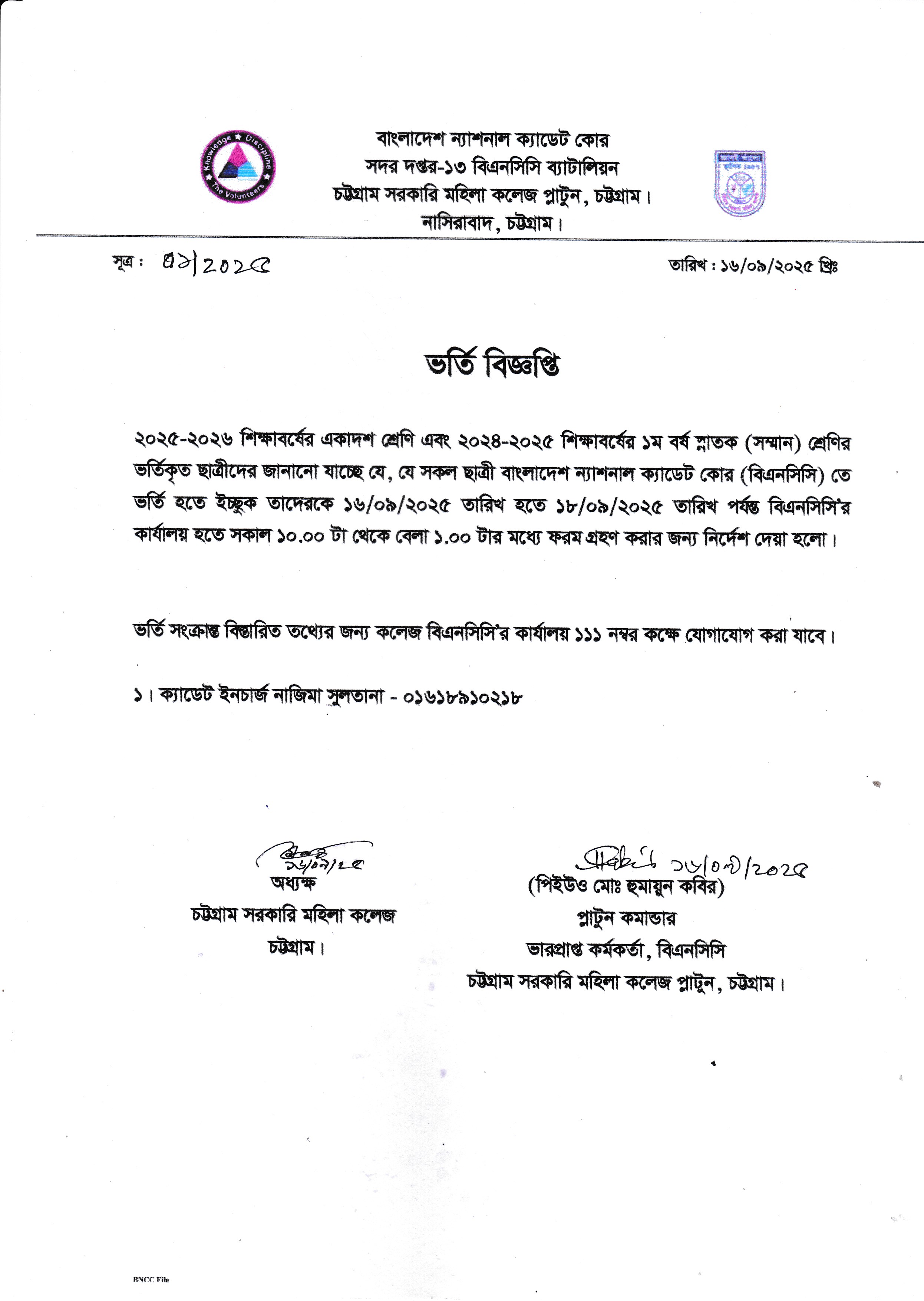 বিএনসিসি প্লাটুনে ভর্তি সংক্রান্ত বিজ্ঞপ্তি