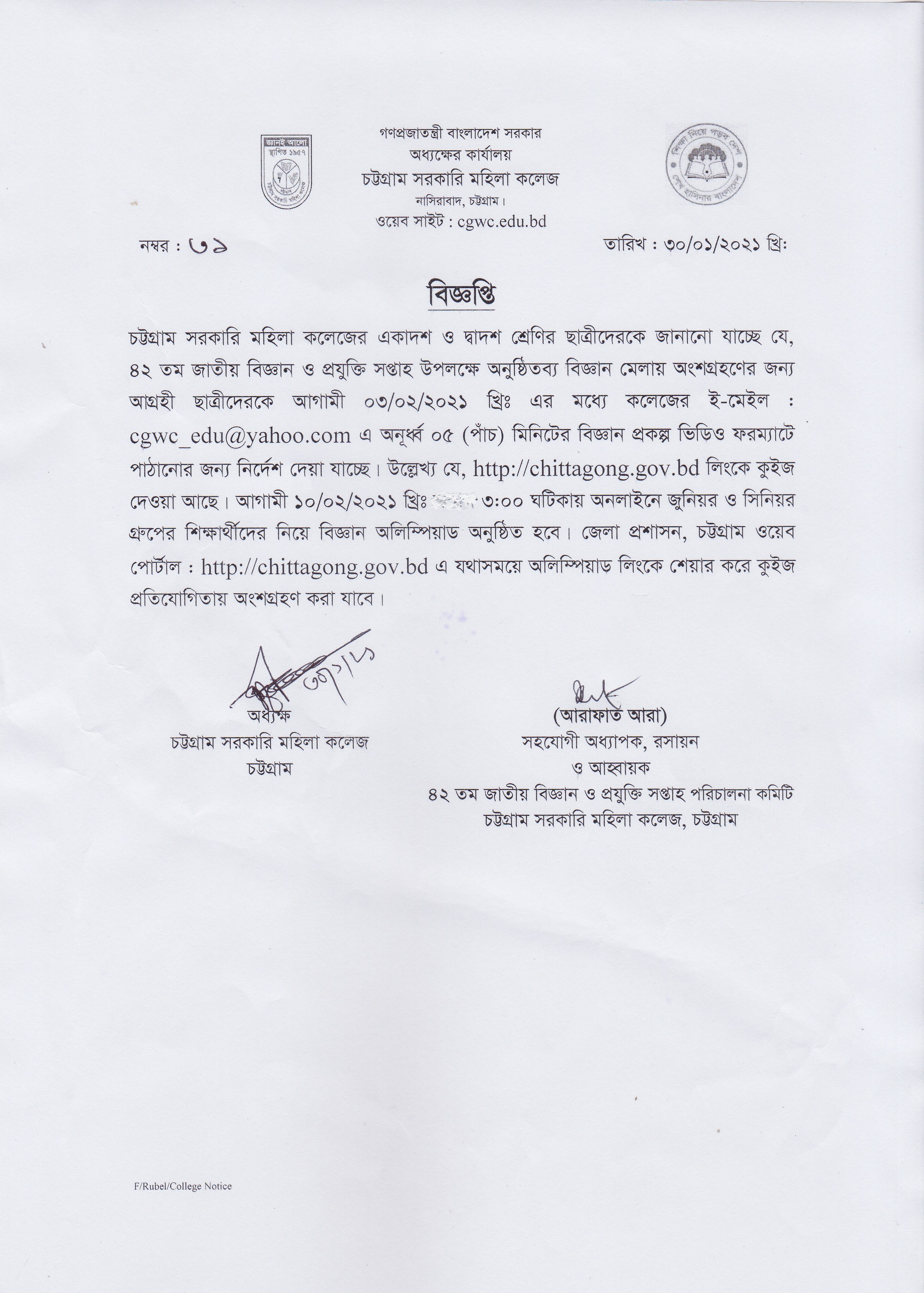 একাদশ ও দ্বাদশ শ্রেণির ছাত্রীদের ৪২ তম জাতীয় বিজ্ঞান সপ্তাহ উপলক্ষে অনুষ্ঠিতব্য বিজ্ঞান মেলায় অংশগ্রহণের জন্য বিজ্ঞপ্তি প্রকাশ (৩০/০১/২০২১)