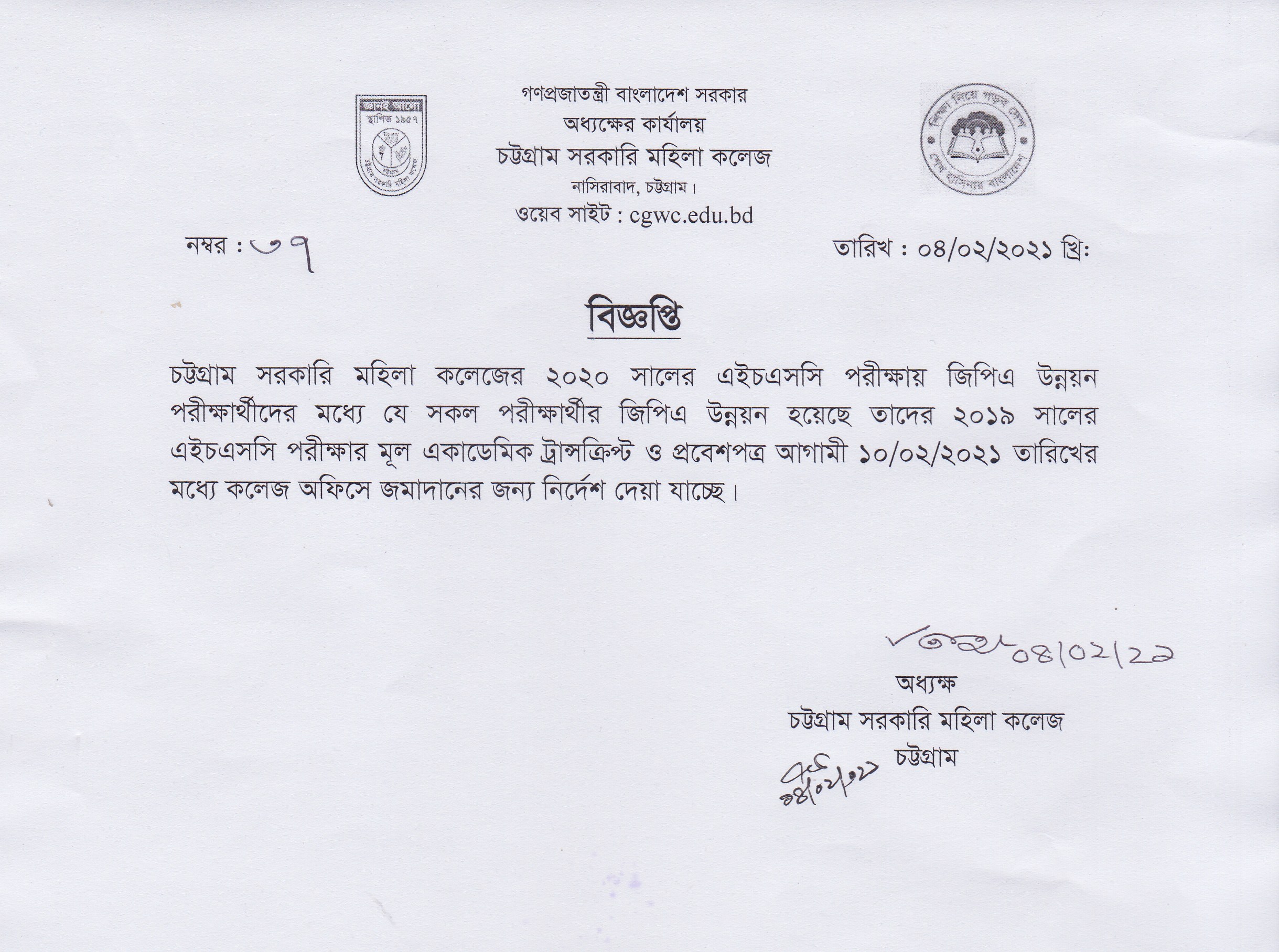 ২০২০ সালের এইচএসসি পরীক্ষায় সে সকল ছাত্রীদের জিপিএ উন্নয়ন হয়েছে তাদের কে ২০১৯ সালের এইচএসসি পরীক্ষার মূল একাডেমিক ট্রান্সক্রিপ্ট ও প্রবেশপত্র জমা দেয়ার বিজ্ঞপ্তি প্রকাশ (০৩/-২/২০২১)