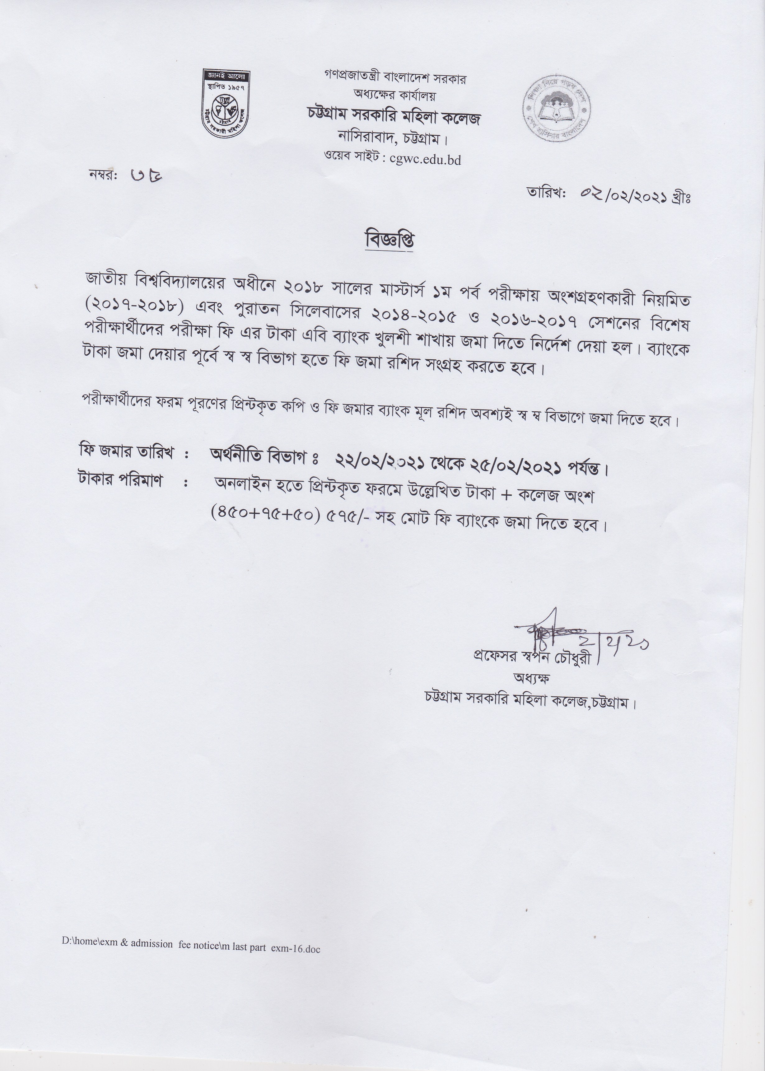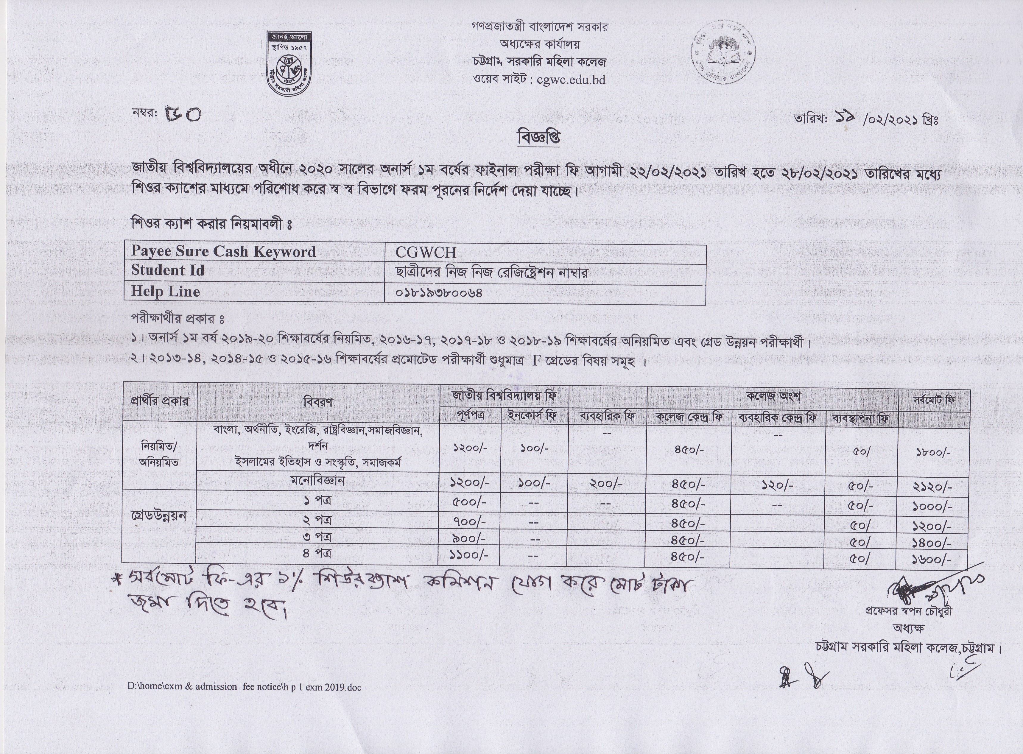 ২০২০ সালের অনার্স ১ম বর্ষের ফাইনাল পরীক্ষার ফি জমাদানের বিজ্ঞপ্তি প্রকাশ (১৩/০২/২০২১)
