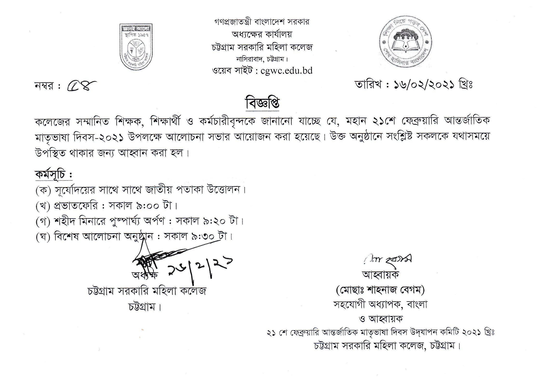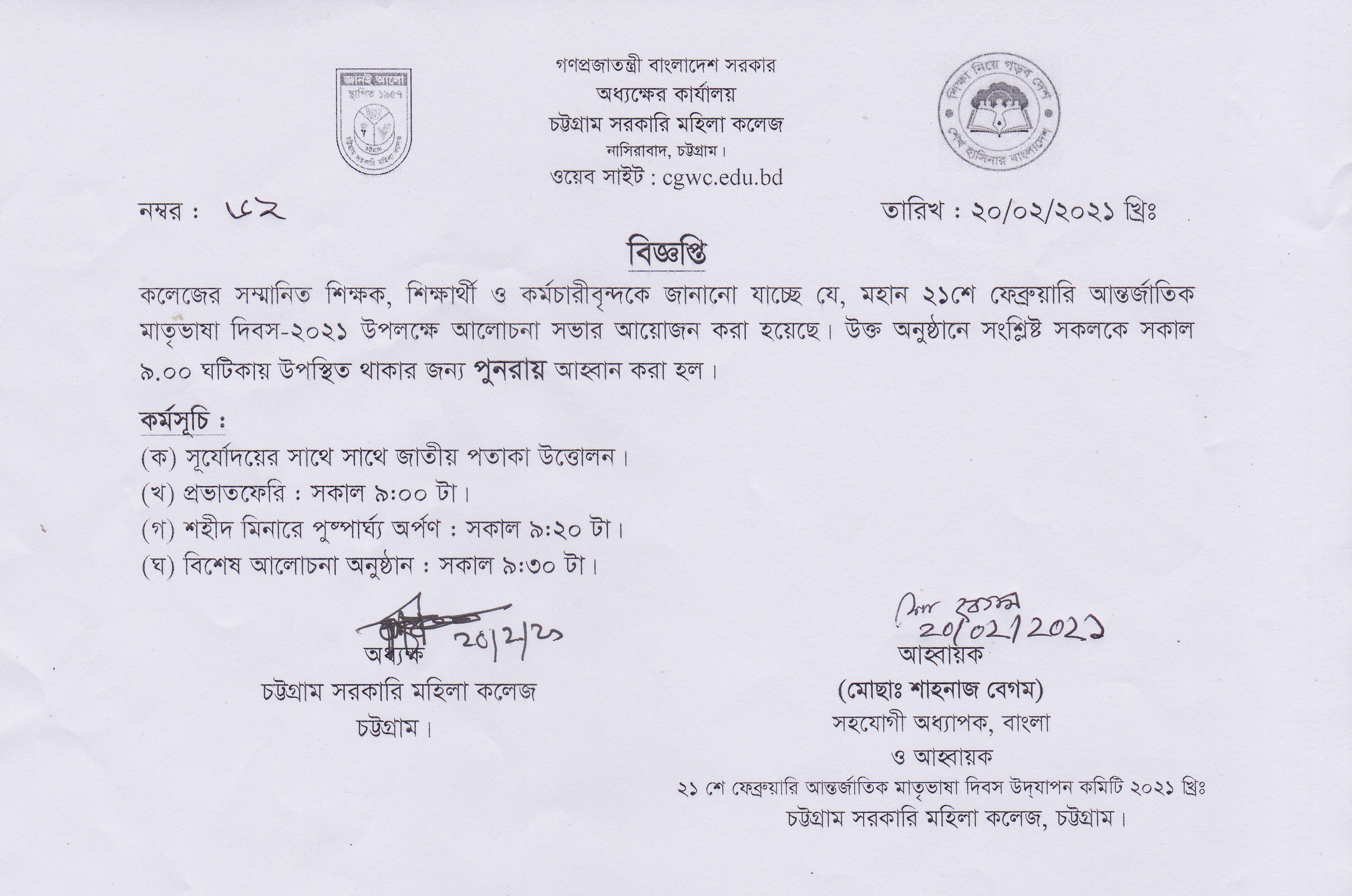 মহান শহীদ দিবস ও আন্তর্জাতিক মাতৃভাষা দিবস ২০২১ উপলক্ষে কলেজে যথাসময়ে উপস্থিত থাকা প্রসঙ্গে।
