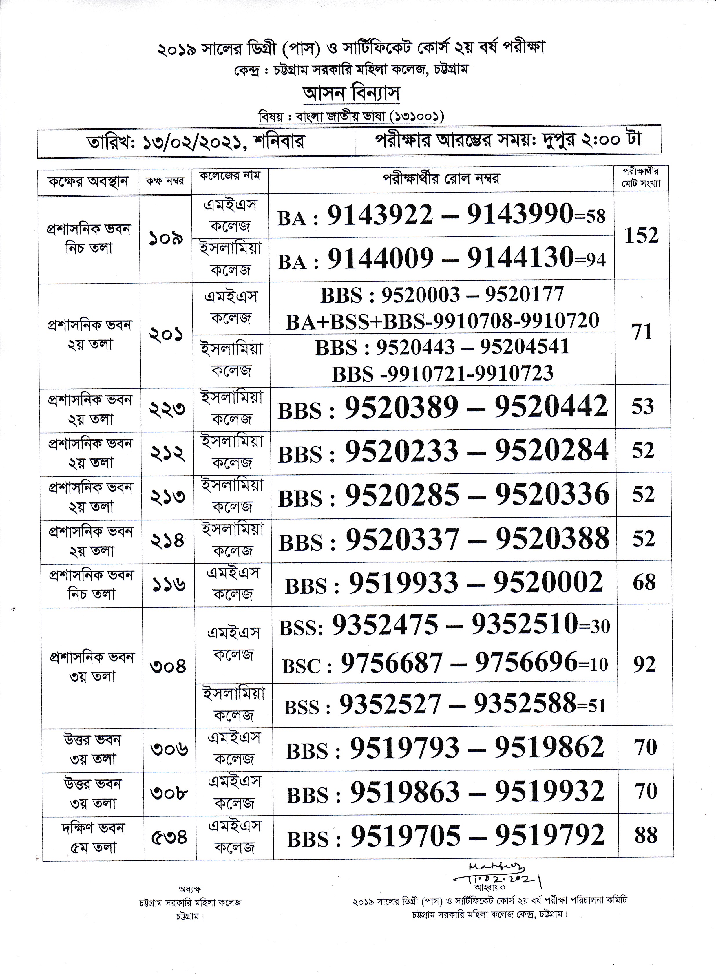 ২০১৯ সালের ডিগ্রী (পাস) ও সার্টিফিকেট কোর্স ২য় বর্ষ পরীক্ষার আসন বিন্যাস (পরীক্ষার তারিখ : ১৩/০২/২০২১ খ্রিঃ)