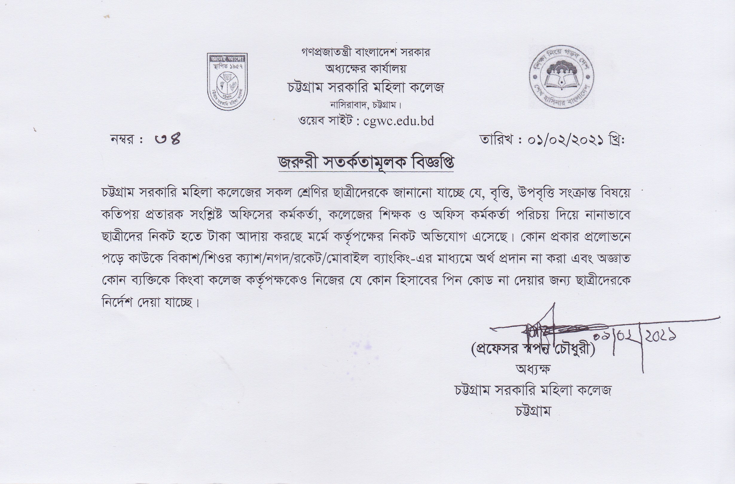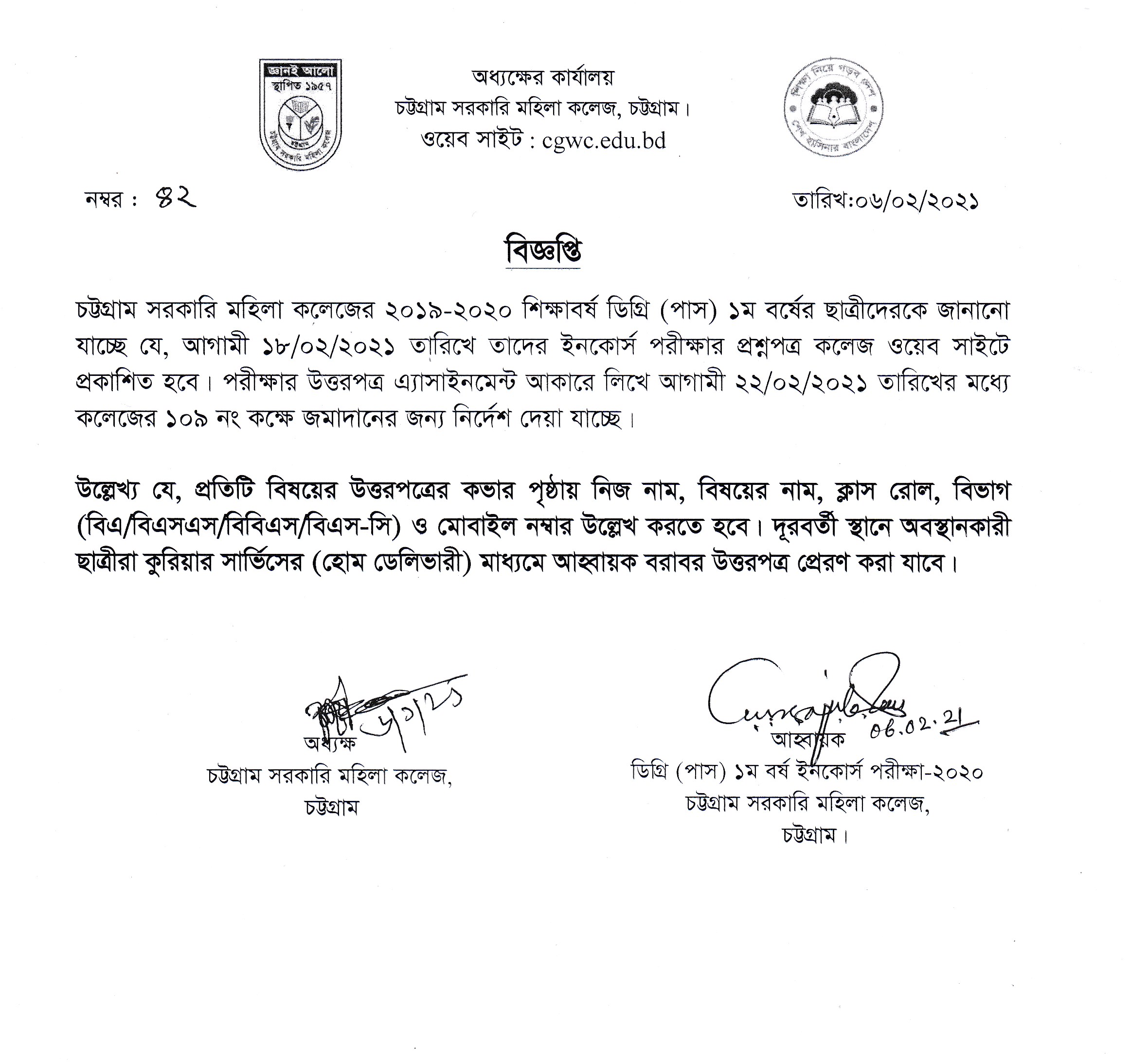 ২০১৯-২০২০ শিক্ষাবর্ষের ডিগ্রী (পাস) ১ম বর্ষ ছাত্রীদের ইনকোর্স পরীক্ষা গ্রহণ সংক্রান্ত বিজ্ঞপ্তি প্রকাশ (০৬/০২/২০২১ খ্রিঃ)