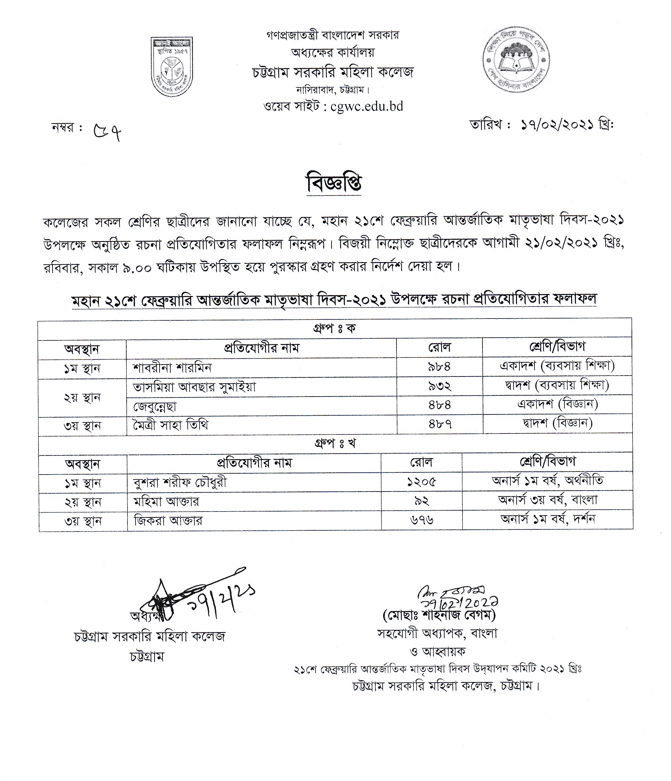 মহান ২১শে ফেব্রুয়ারি আন্তর্জাতিক মাতৃভাষা দিবস-২০২১ উপলক্ষে কলেজে রচনা প্রতিযোগিতা আয়োজনের বিজ্ঞপ্তি প্রকাশ (০৭/০২/২০২১ খ্রিঃ)