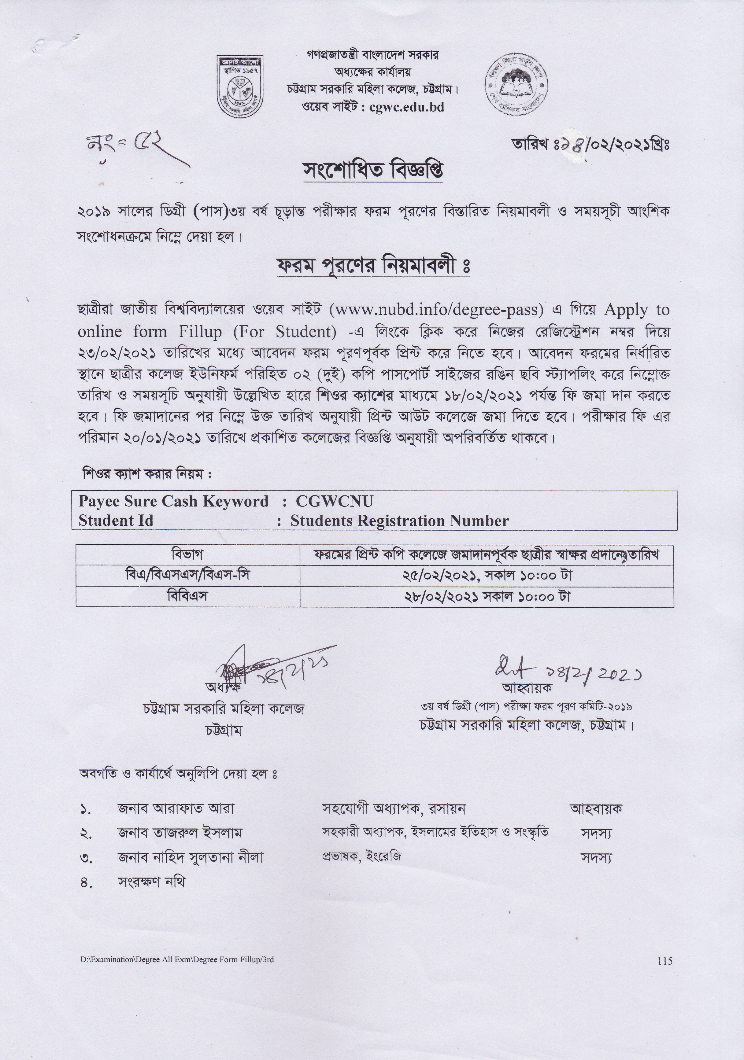 ২০১৯ সালে ডিগ্রি (পাস) ৩য় বর্ষ চুড়ান্ত পরীক্ষার ফরম পূরণের সংশোধিত বিজ্ঞপ্তি প্রকাশ (১৪/০২/২০২১)
