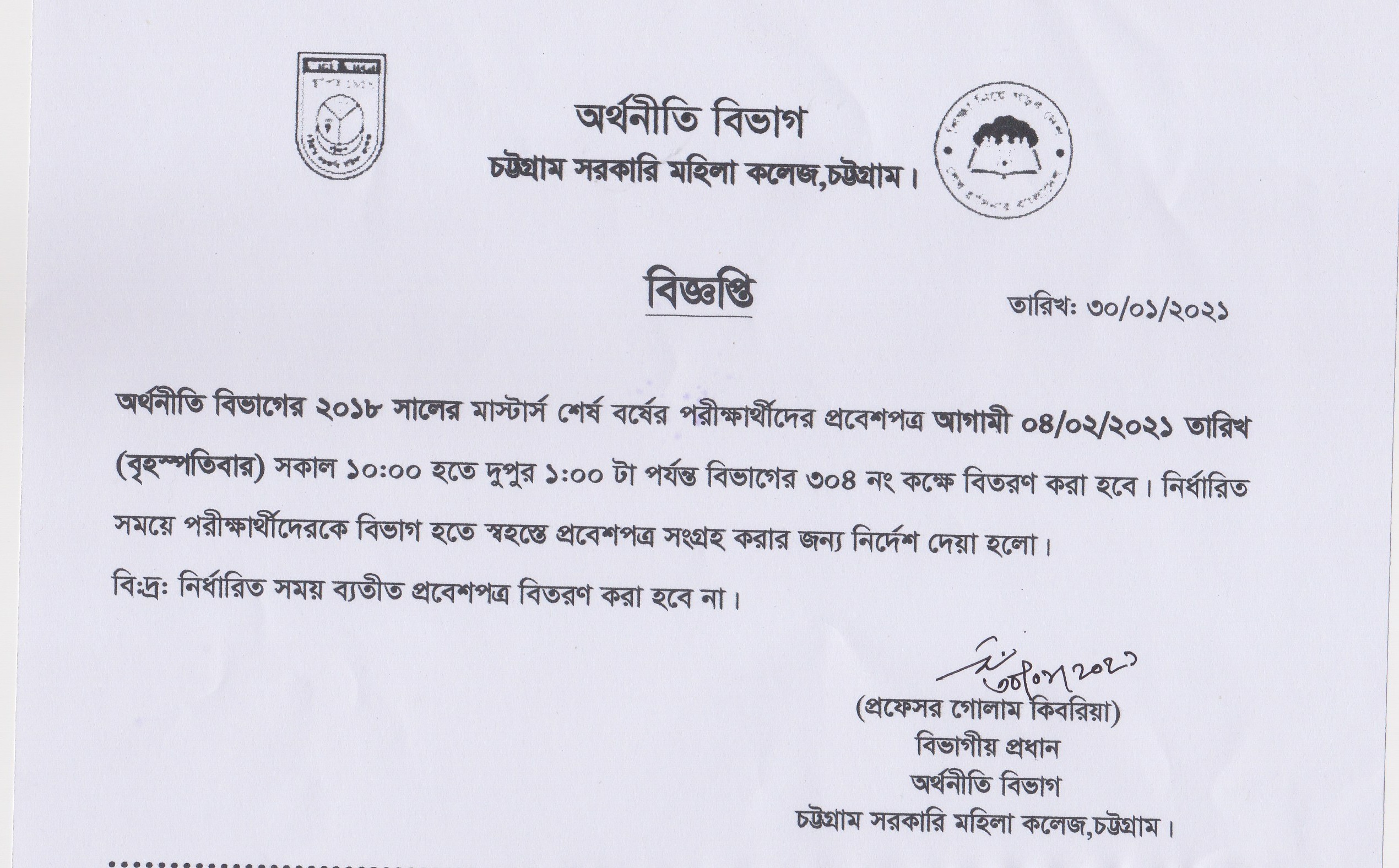 অর্খনীতি বিভাগের ২০১৮ সালের মাস্টার্স শেষ বর্ষের পরীক্ষার্থীদের প্রবেশপত্র বিতরণ সংক্রান্ত বিজ্ঞপ্তি প্রকাশ (৩০/০১/২০২১)