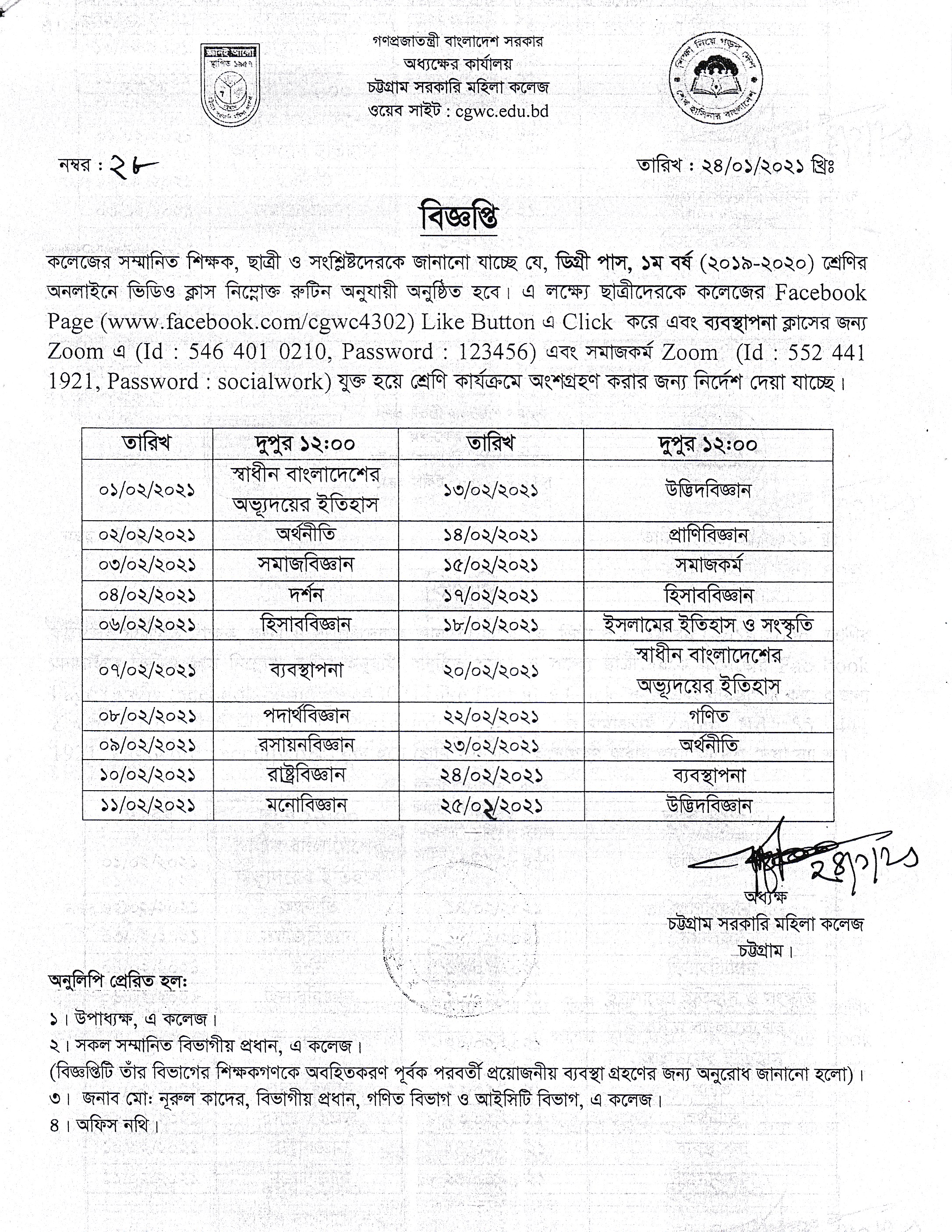 ২০১৯-২০২০ শিক্ষাবর্ষের ডিগ্রী (পাস) ১ম বর্ষ অনলাইনে ভিডিও এবং জুম ক্লাসের রুটিন প্রকাশ (২৪/০১/২০২১ খ্রিঃ)