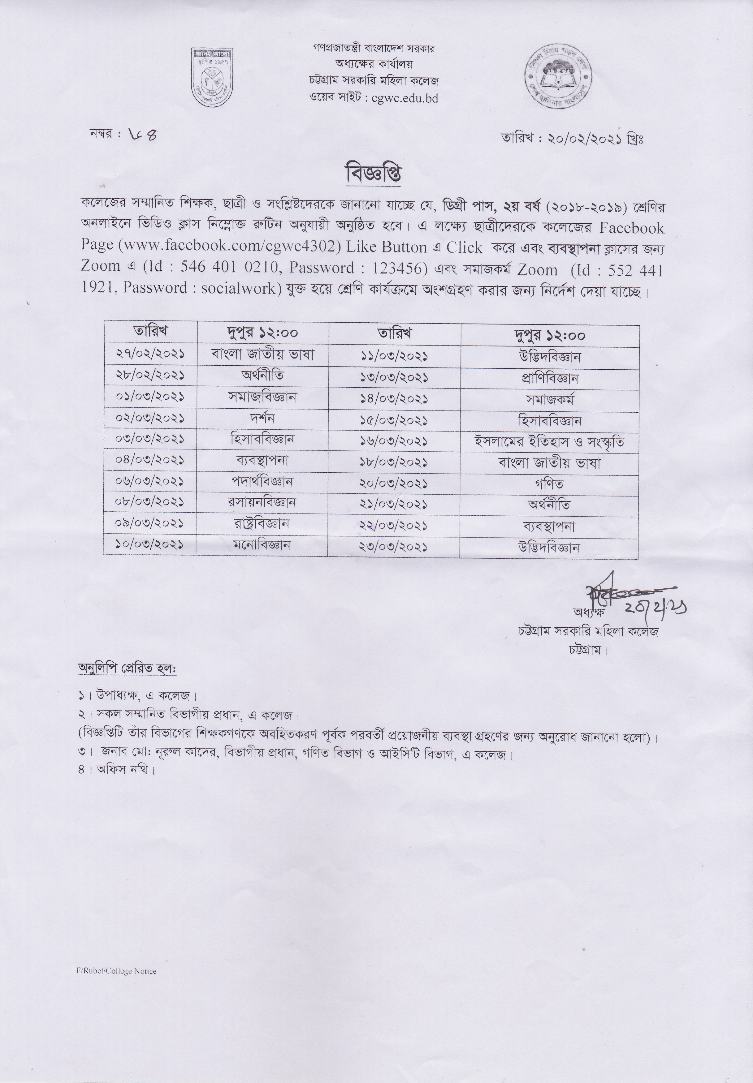 ২০১৮-২০১৯ শিক্ষাবর্ষের ডিগ্রী (পাস) ২য় বর্ষ অনলাইনে ভিডিও এবং জুম ক্লাসের রুটিন প্রকাশ (২০/০২/২০২১ খ্রিঃ)