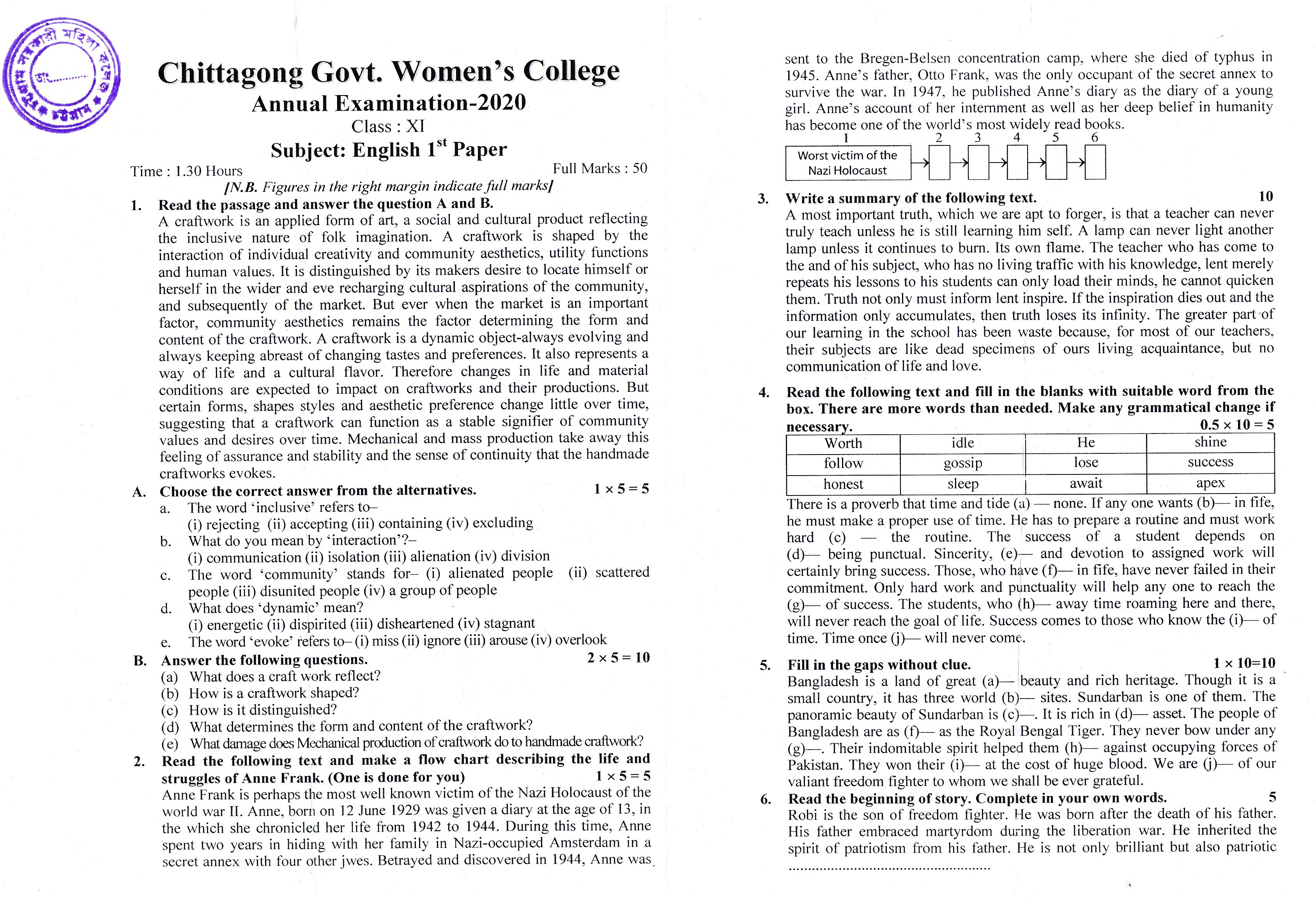২০১৯-২০২০ শিক্ষাবর্ষের উচ্চ মাধ্যমিক একাদশ শ্রেণির (পুরাতন ব্যাচ) বার্ষিক পরীক্ষা-২০২০ এর ইংরেজি ১ম পত্র প্রশ্ন (১৬/১০/২০২০ খ্রিঃ)