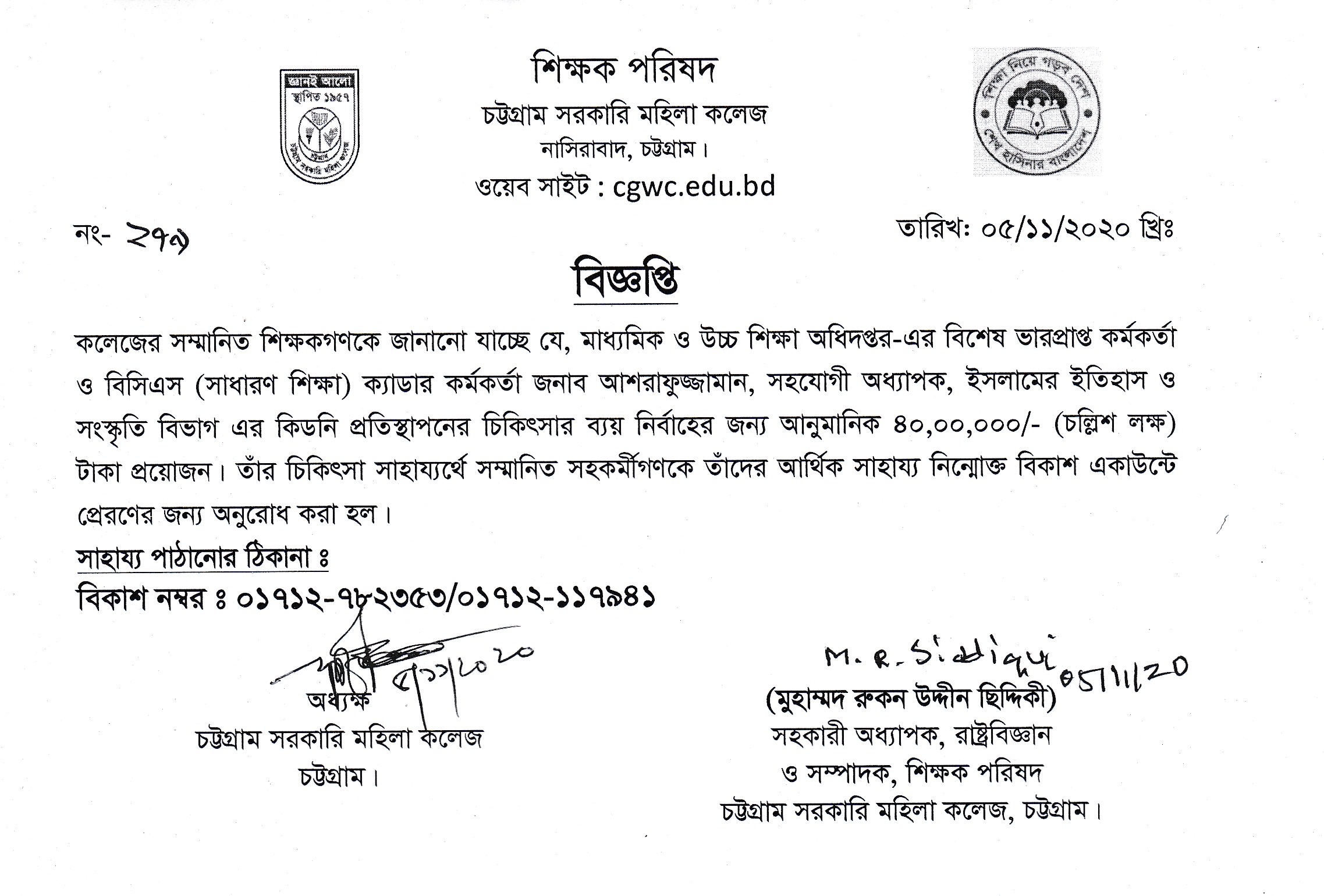 জনাব আশরাফুজ্জামান, সহযোগী অধ্যাপক, ইসলামের ইতিহাস ও সংস্কৃতি বিভাগ এর চিকিৎসার জন্য আর্থিক সাহায্যের বিজ্ঞপ্তি (০৫/১১/২০২০ খ্রিঃ)