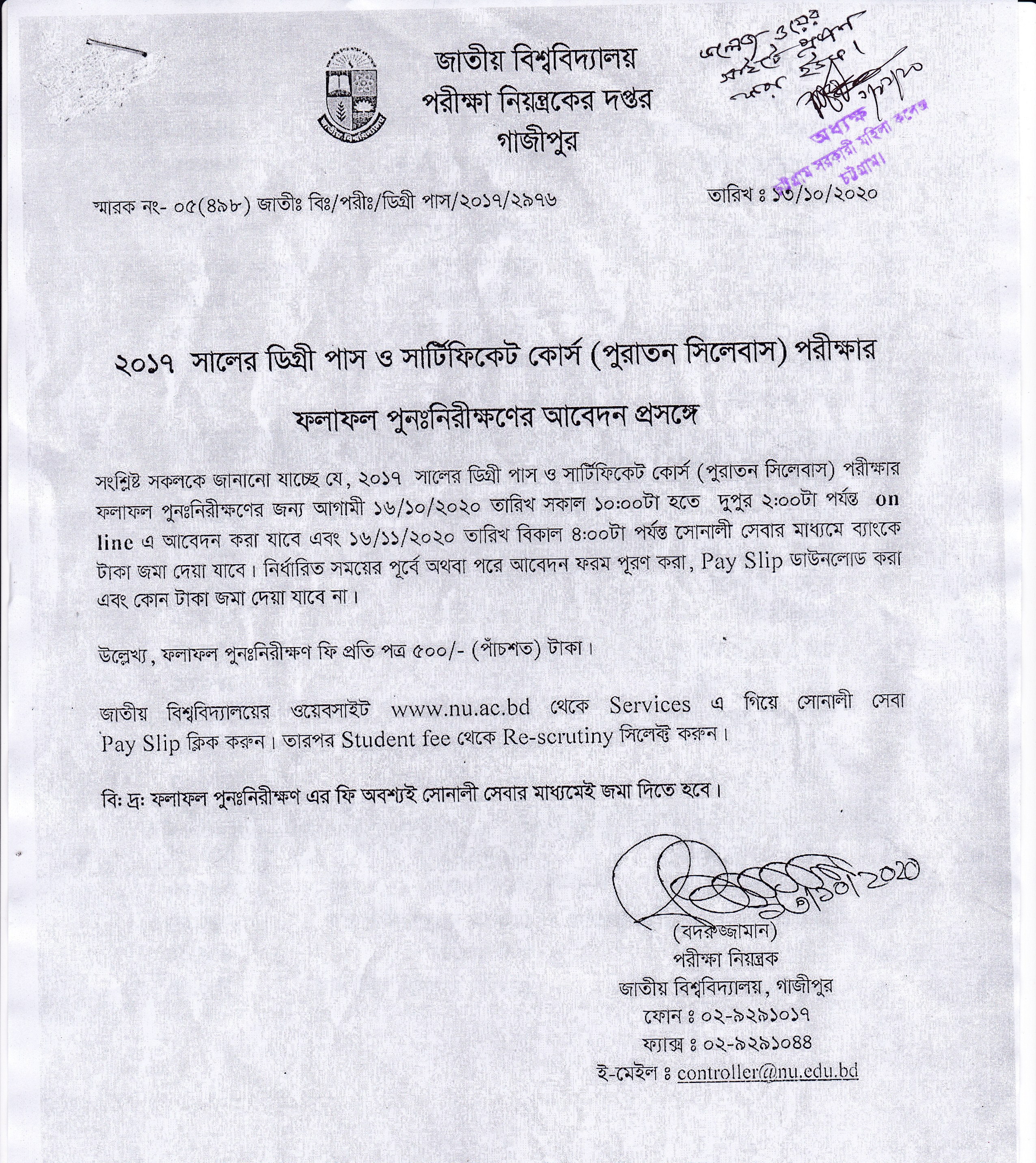 ২০১৭ সালের ডিগ্রী পাস ও সার্টিফিকেট কোর্স (পুরাতন সিলেবাস) পরীক্ষার ফলাফল পুনঃনিরীক্ষণের আবেদন প্রসঙ্গে