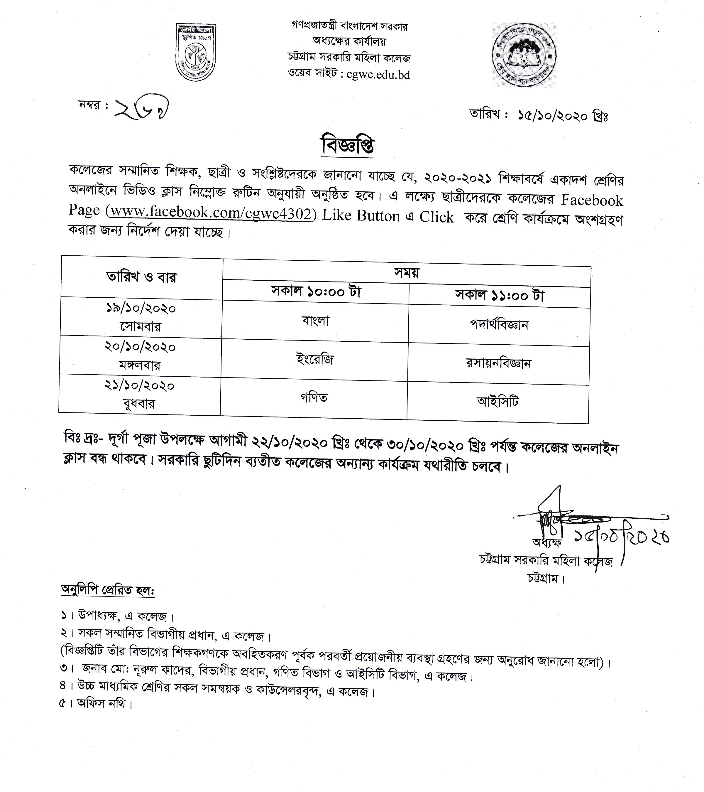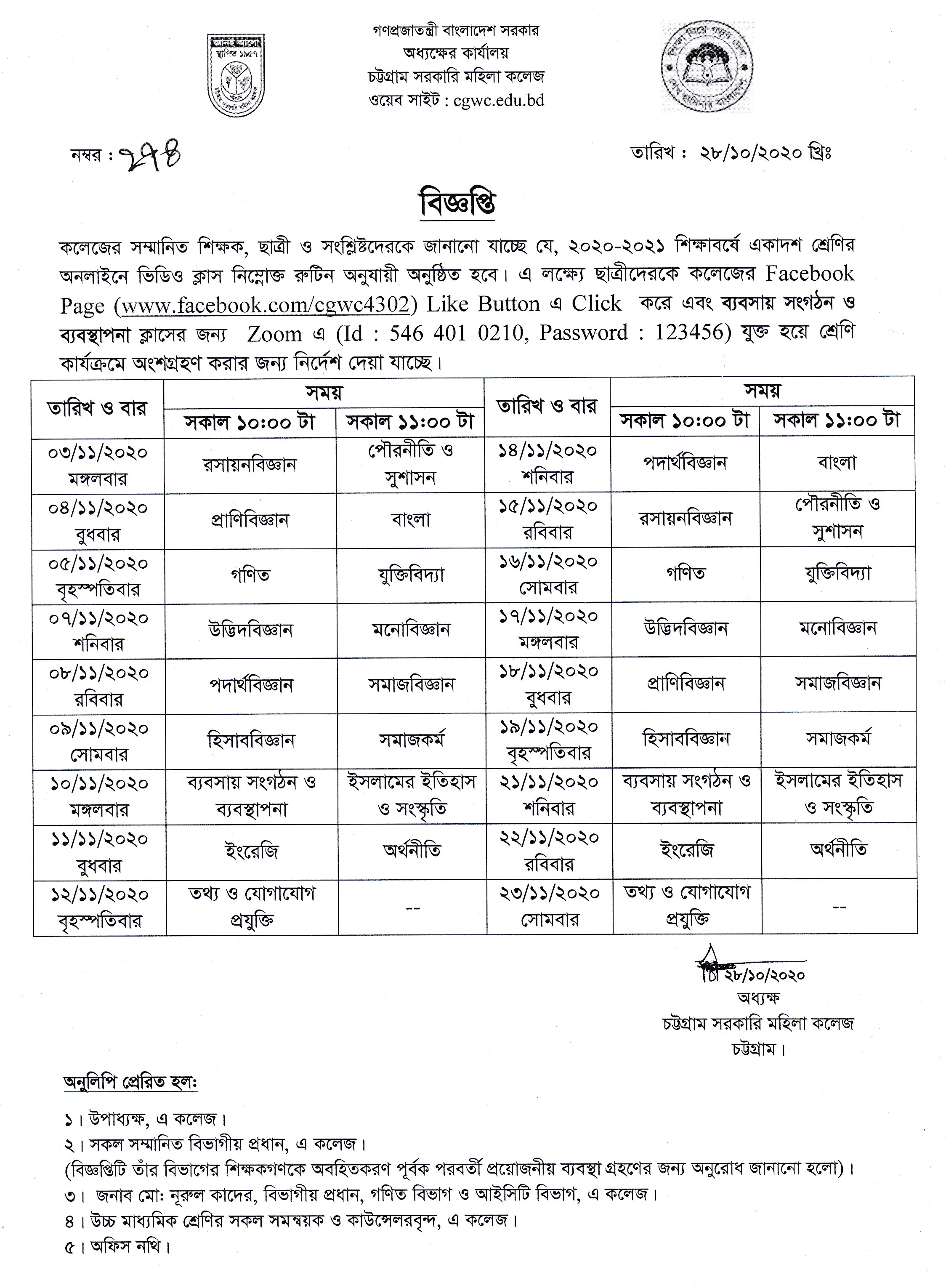 ২০২০-২০২১ শিক্ষাবর্ষের উচ্চ মাধ্যমিক একাদশ শ্রেনির ছাত্রীদের অনলাইন ক্লাস রুটিন প্রকাশ (২৮/১০/২০২০)