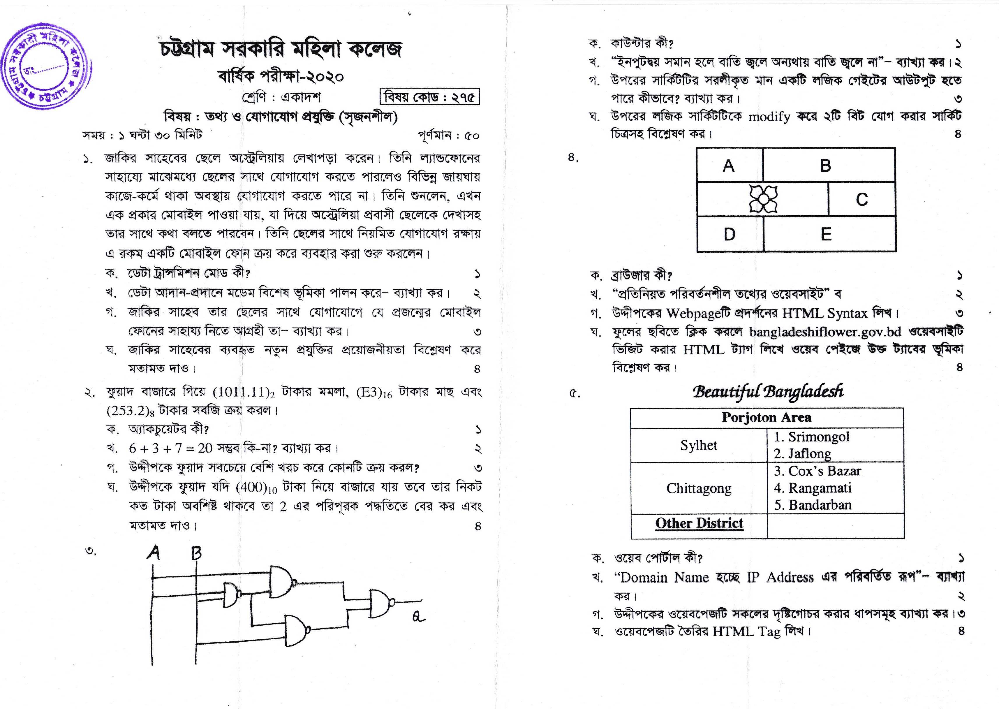 ২০১৯-২০২০ শিক্ষাবর্ষের উচ্চ মাধ্যমিক একাদশ শ্রেণির (পুরাতন ব্যাচ) বার্ষিক পরীক্ষা-২০২০ এর তথ্য ও যোগাযোগ প্রযুক্তি প্রশ্নপত্র (১৫/১০/২০২০ খ্রিঃ)