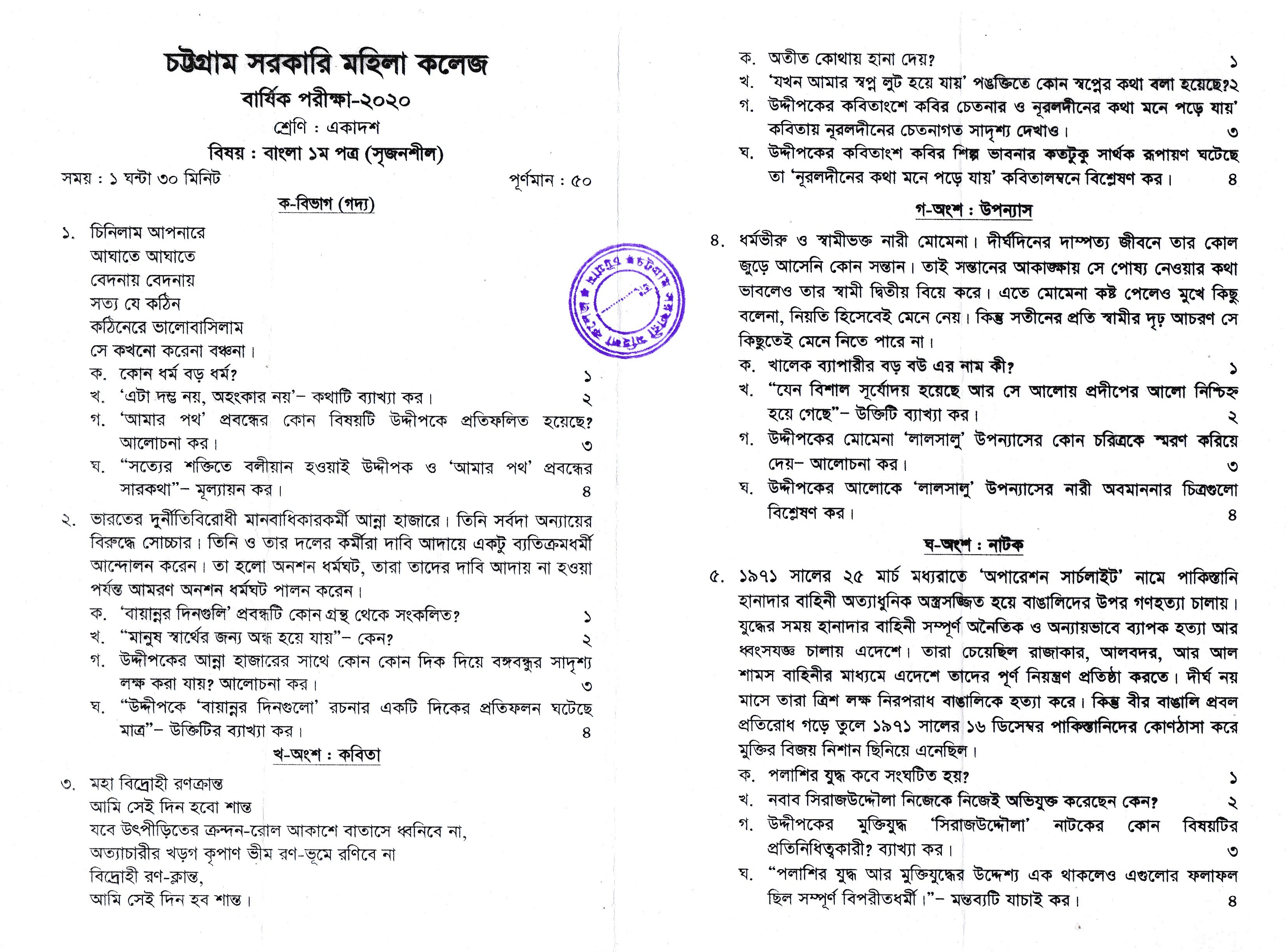 ২০১৯-২০২০ শিক্ষাবর্ষের উচ্চ মাধ্যমিক একাদশ শ্রেণির (পুরাতন ব্যাচ) বার্ষিক পরীক্ষা-২০২০ এর বাংলা ১ম পত্র প্রশ্ন (১৭/১০/২০২০ খ্রিঃ)