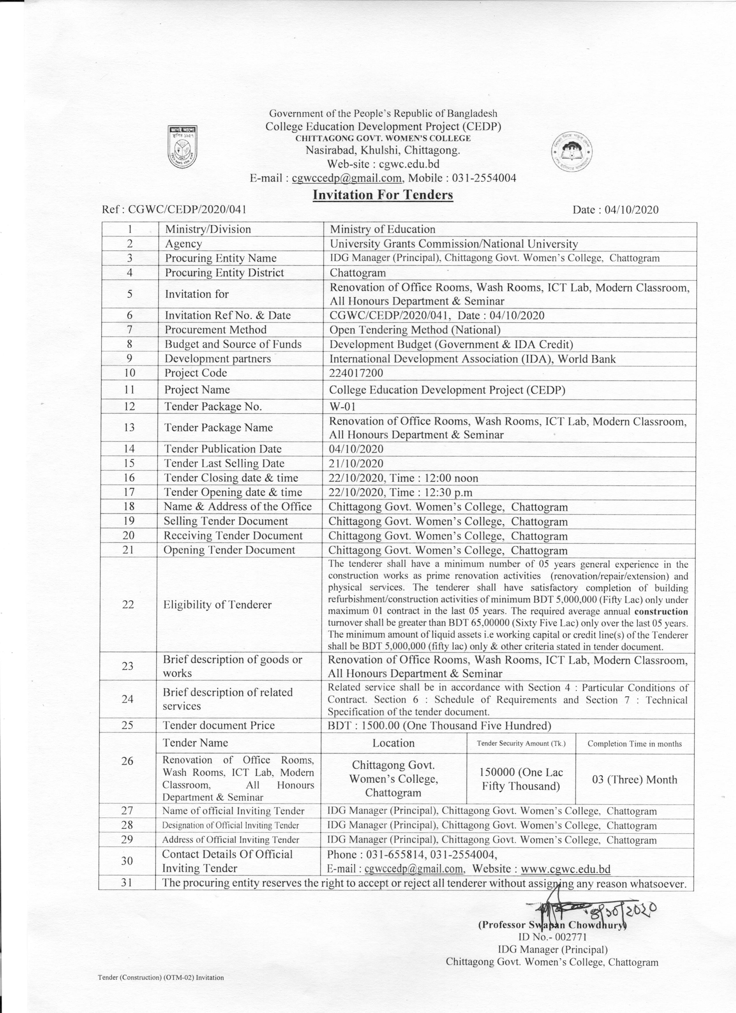 জনাব জহুরা বেগম, সহকারী অধ্যাপক, বাংলা চট্টগ্রাম সরকারি মহিলা কলেজ, চট্টগ্রাম এর NOC form