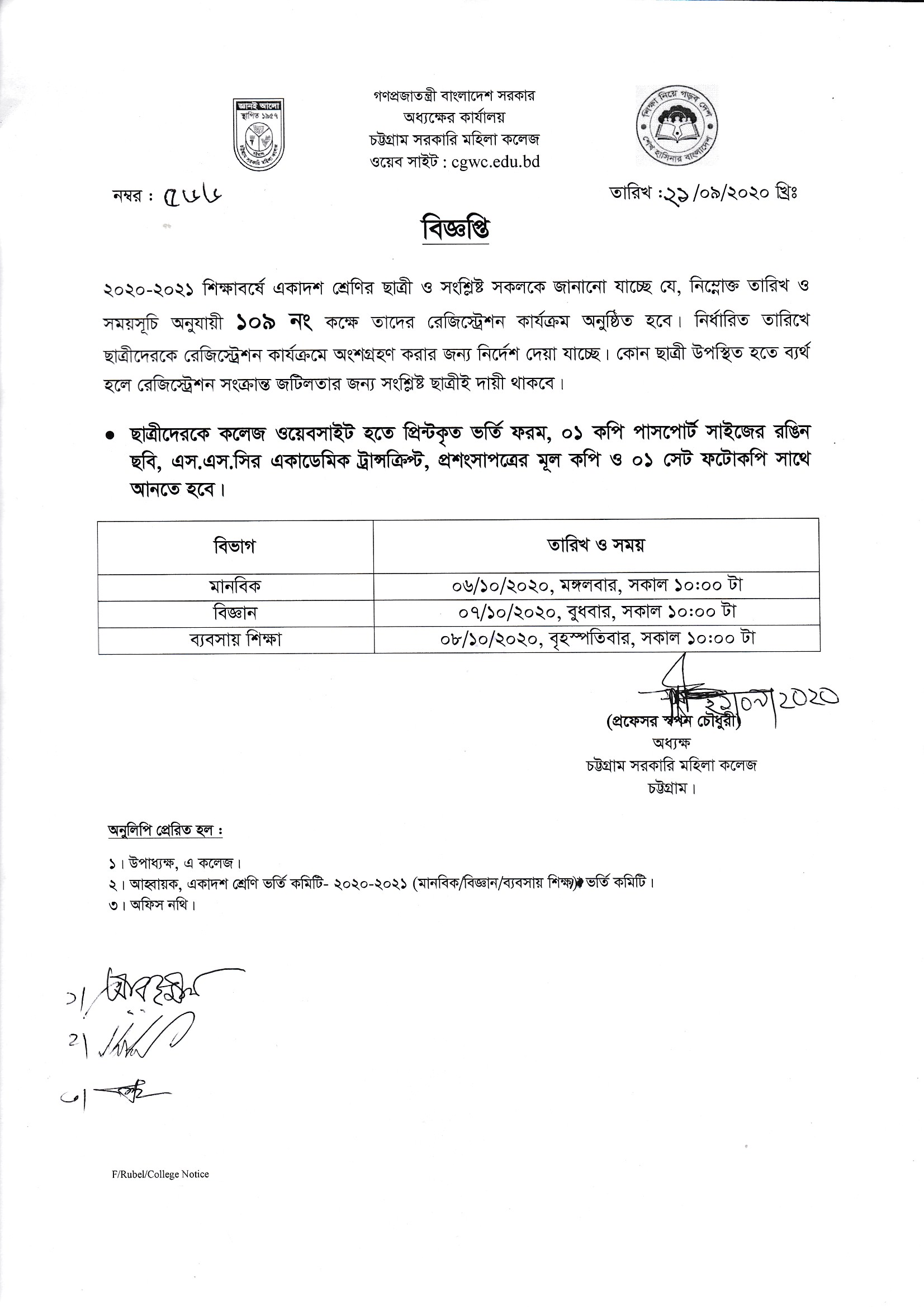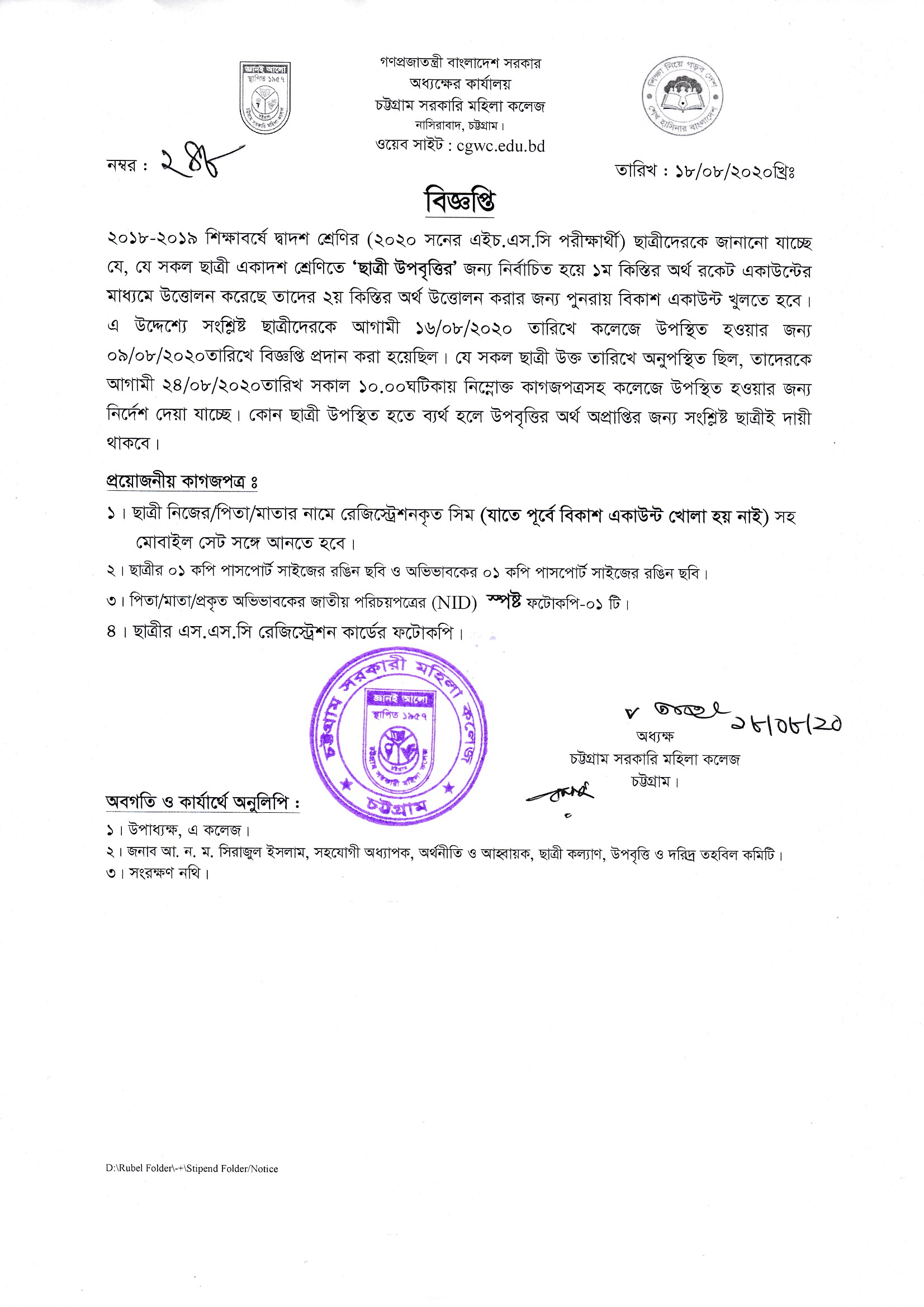 ২০১৯-২০২০ শিক্ষাবর্ষে একাদশ (পুরাতন ব্যাচ) শ্রেণির ছাত্রীদের ‘ছাত্রী উপবৃত্তির’ জন্য নিন্মোক্ত রোলনম্বরধারী ছাত্রীদের প্রয়োজনীয় কাগজপত্রসহ কলেজে উপস্থিত থাকা প্রসঙ্গে