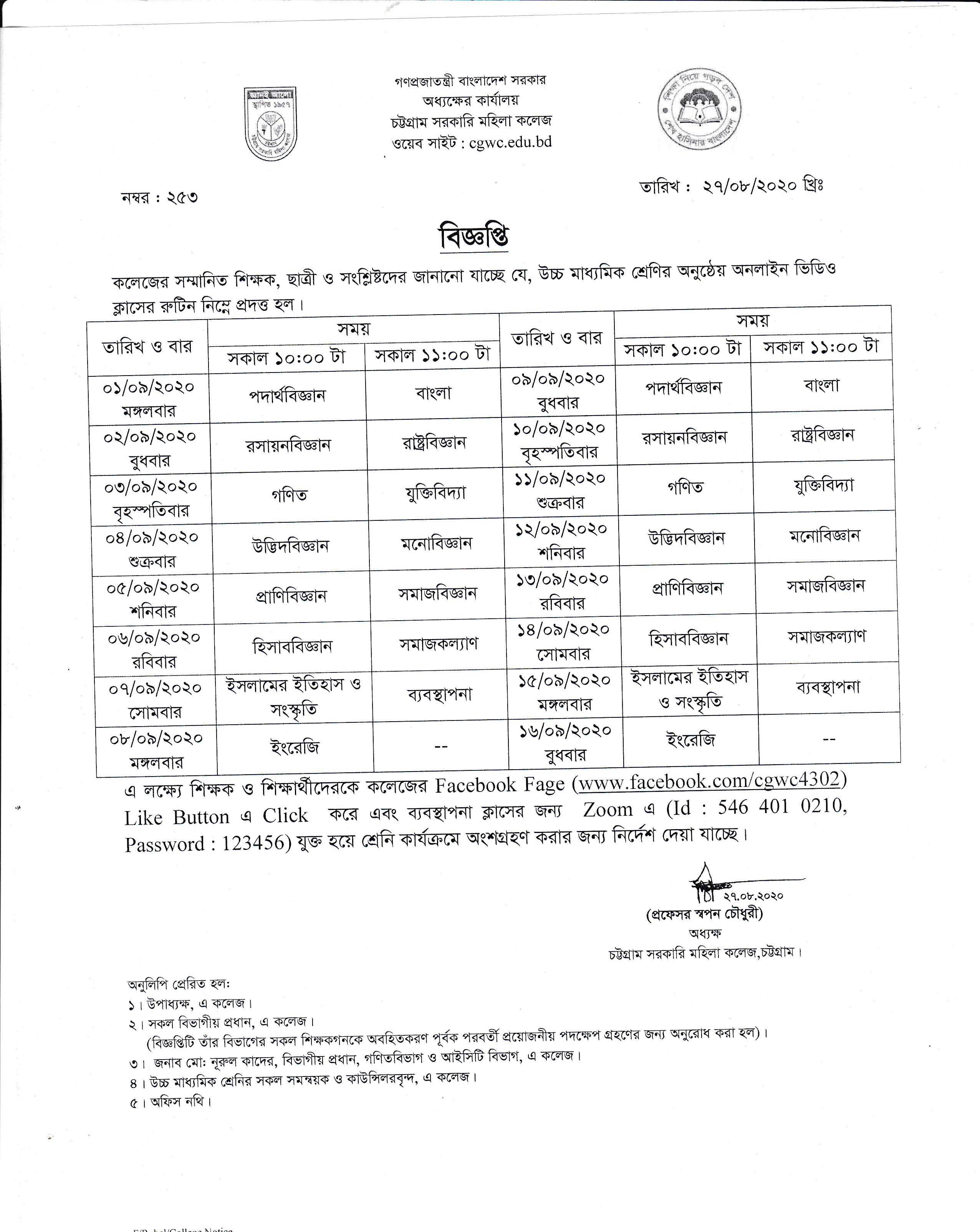 উচ্চ মাধ্যমিক শ্রেনির ছাত্রীদের অনলাইন ক্লাস রুটিন
